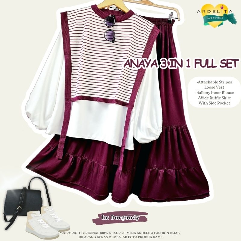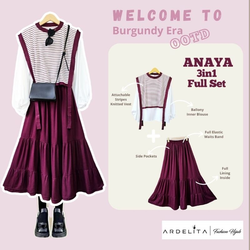 ARDELITA - Anaya 3in1 Set Rok OOTD Wanita Remaja Dewasa Hijab Burgundy Trend Baju Pakaian Terbaru 2025