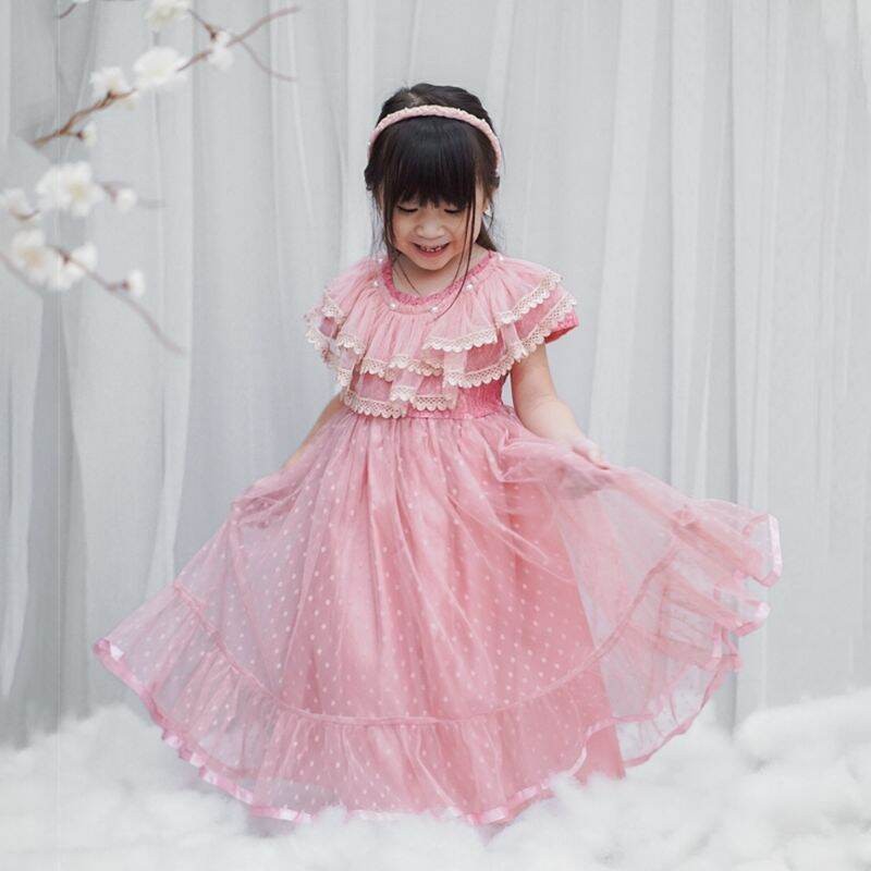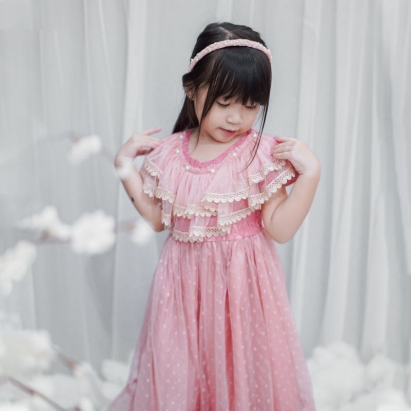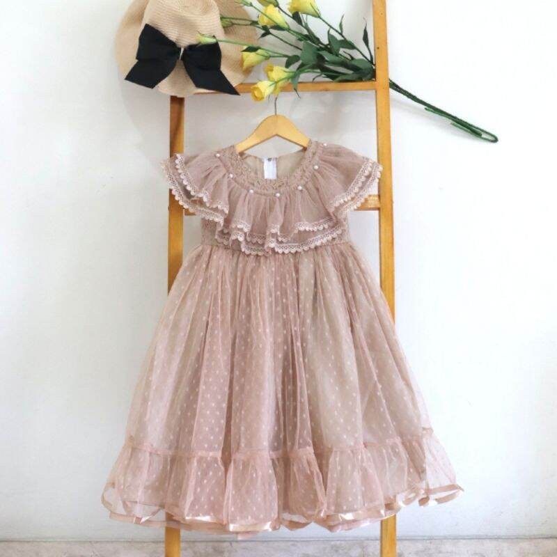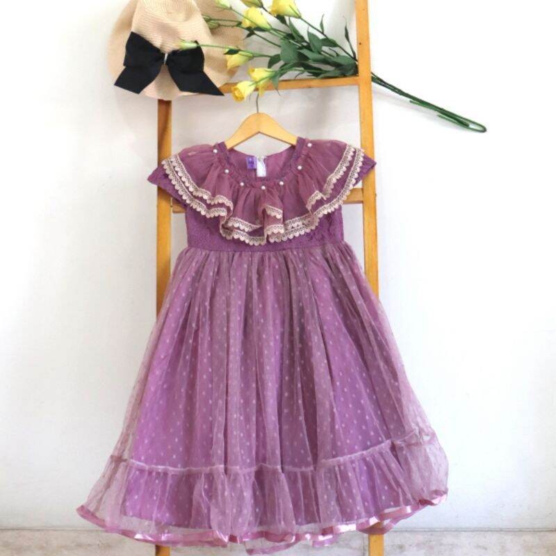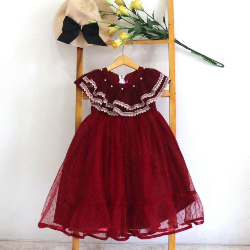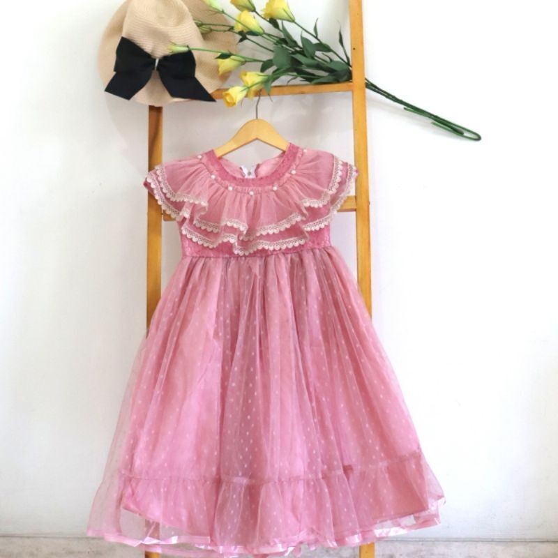 dress gaun pesta anak perempuan premium polkadot renda di leher / gaun salsa mewah dres ulang tahun