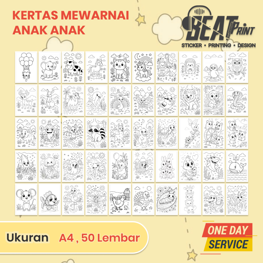 50 Lembar Mewarnai A4 - Versi Hewan Lucu untuk Anak Usia Dini / Pemula HVS | Beat Print