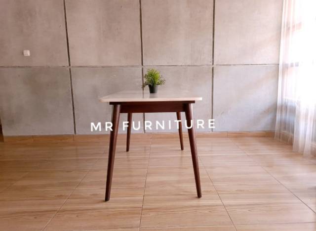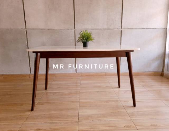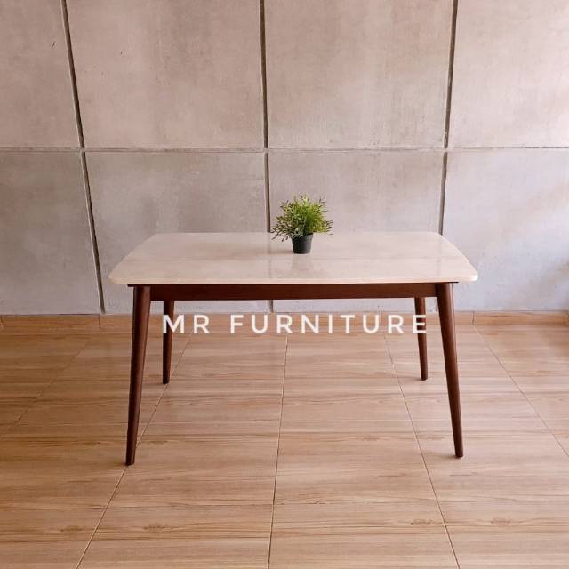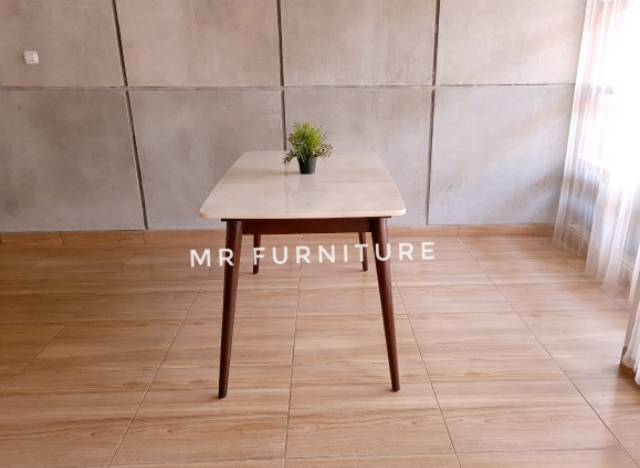 meja makan marmer krem kaki kayu jati 140x80x75 cm