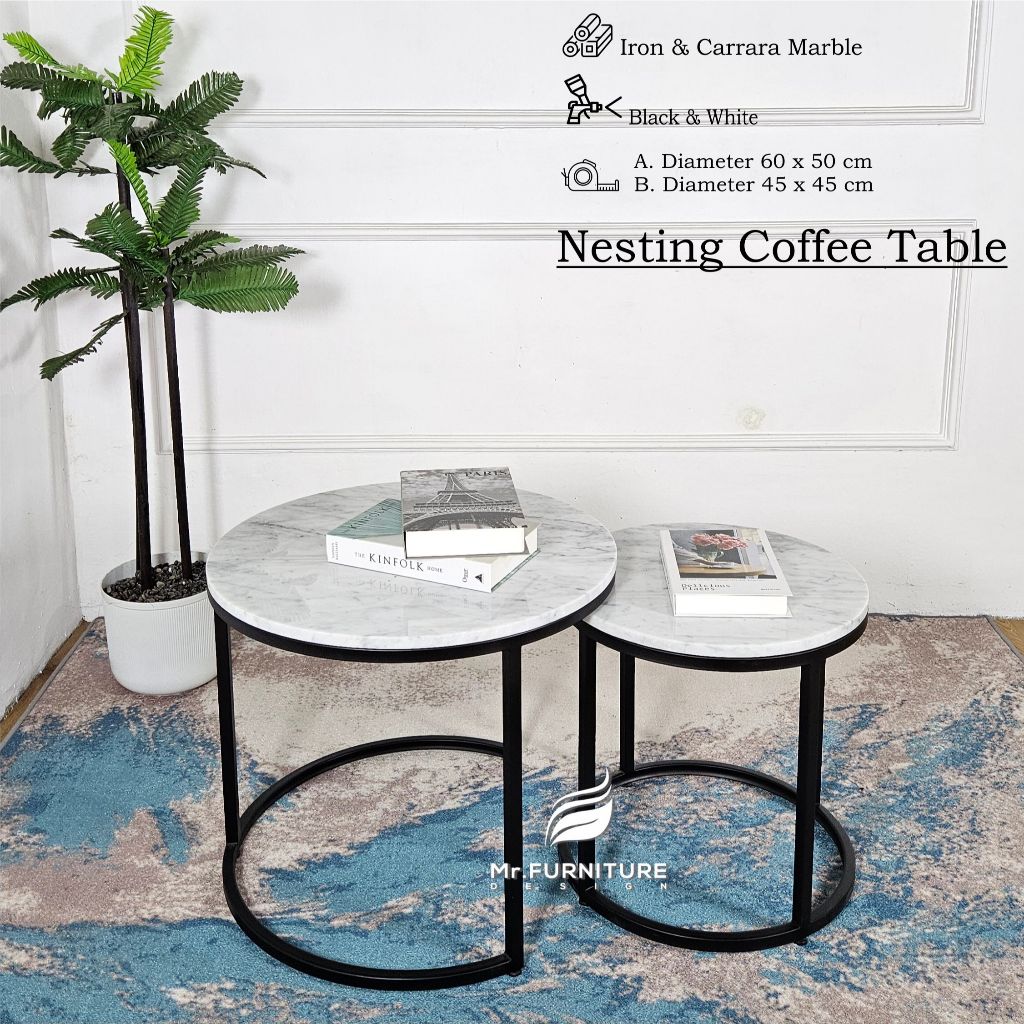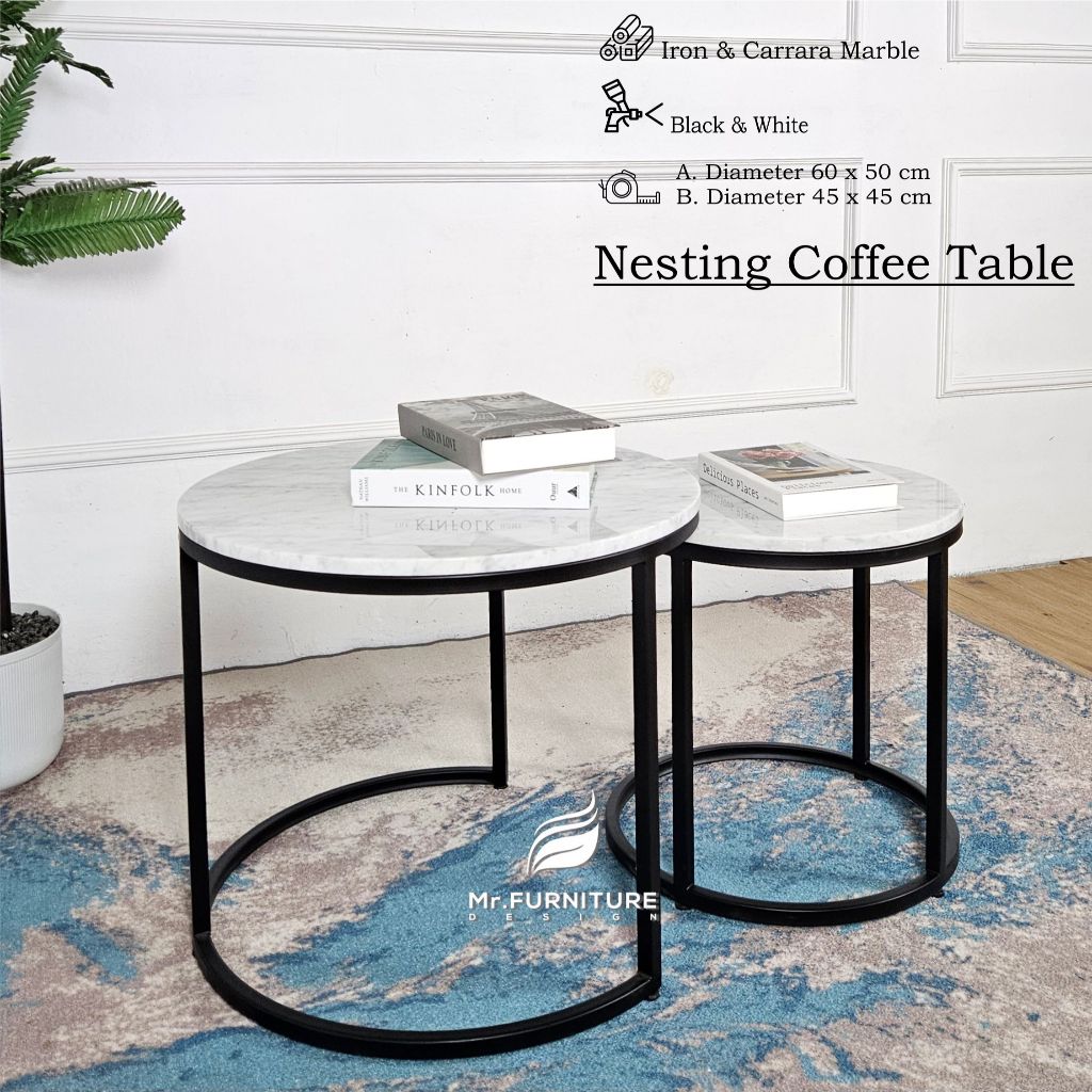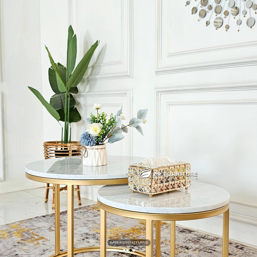 Set Meja Tamu Marmer Putih Nesting 2in1 | Meja Bundar Elegan Kaki Gold – Minimalis Modern