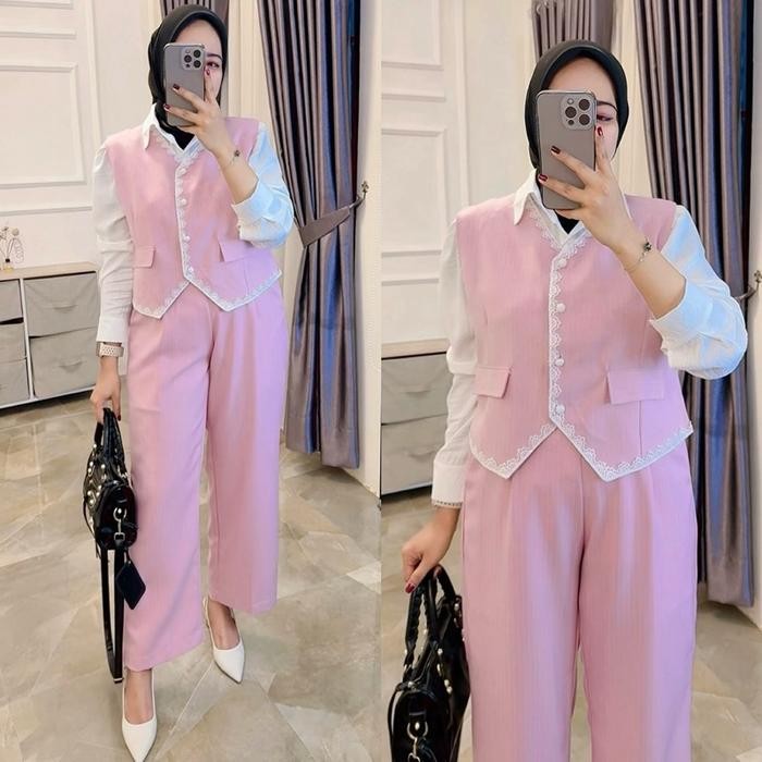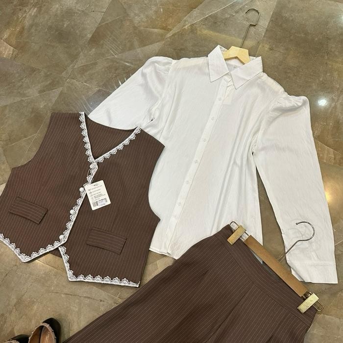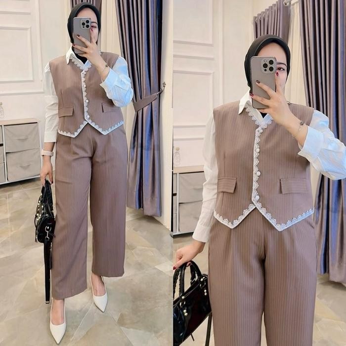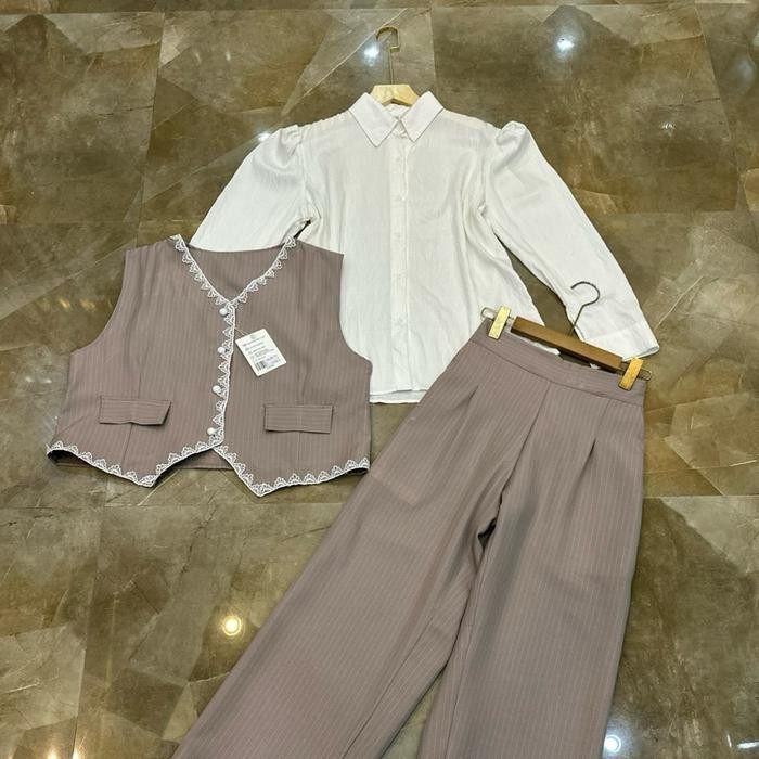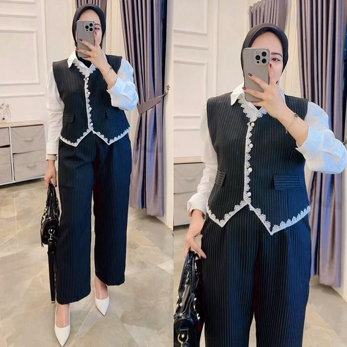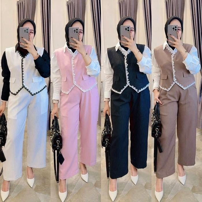 Setelan 3in1 Soraya Salur katun tweed import marga fashion trendy dan korean style One Set 3in1 Vest