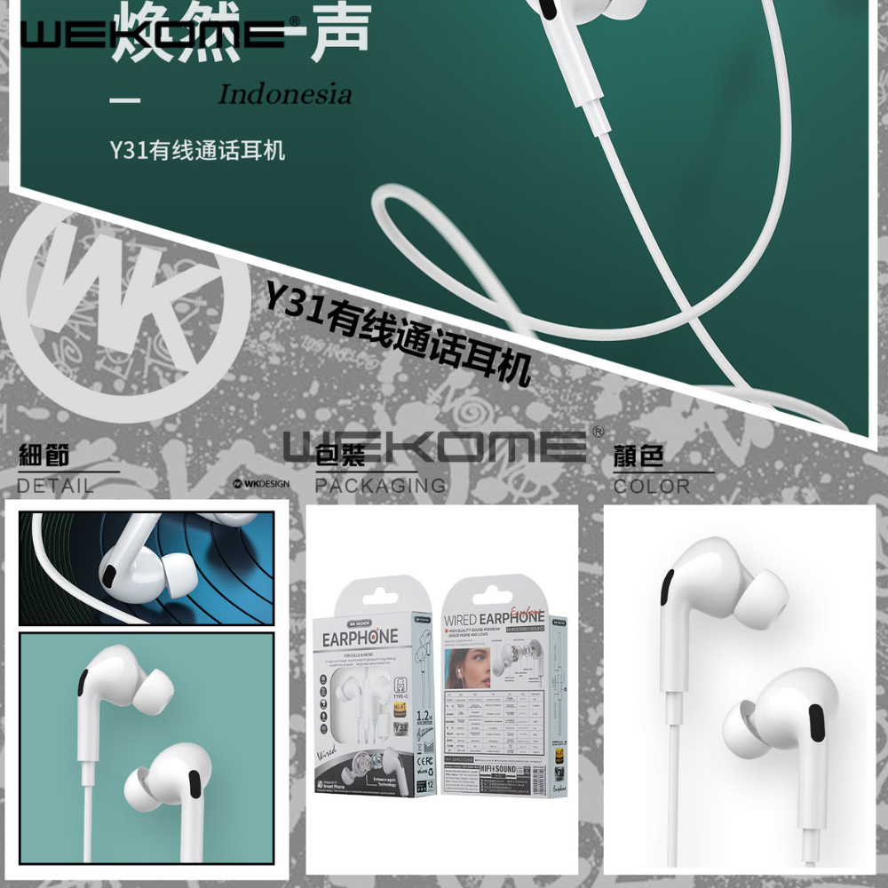 Headset Kabel Wired Earphone Iphone, Type C, Jack 3.5mm Y31 WEKOME