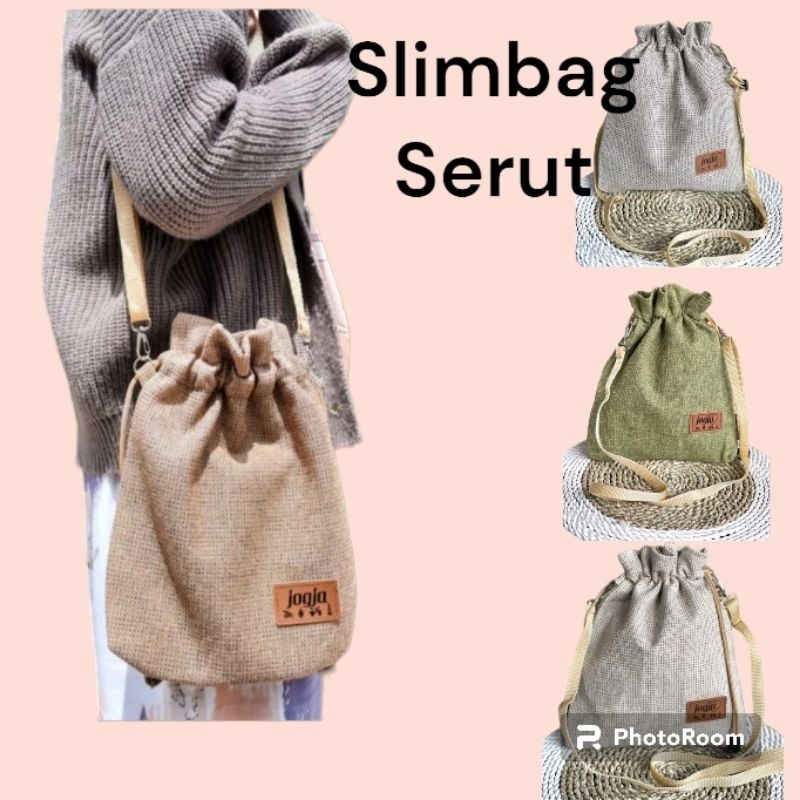 sling bag serut goni premium / tas oleh oleh jogja / slingbag serut bahan tenun tebal/slingbag serut jinny goni sintetis