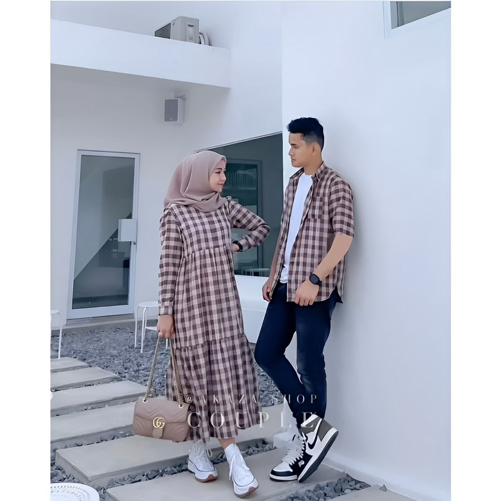 RMDN Couple Pasangan Gamis Wanita Set Kemeja Pria Bahan Katun Kotak Premium Setelan Baju Muslim