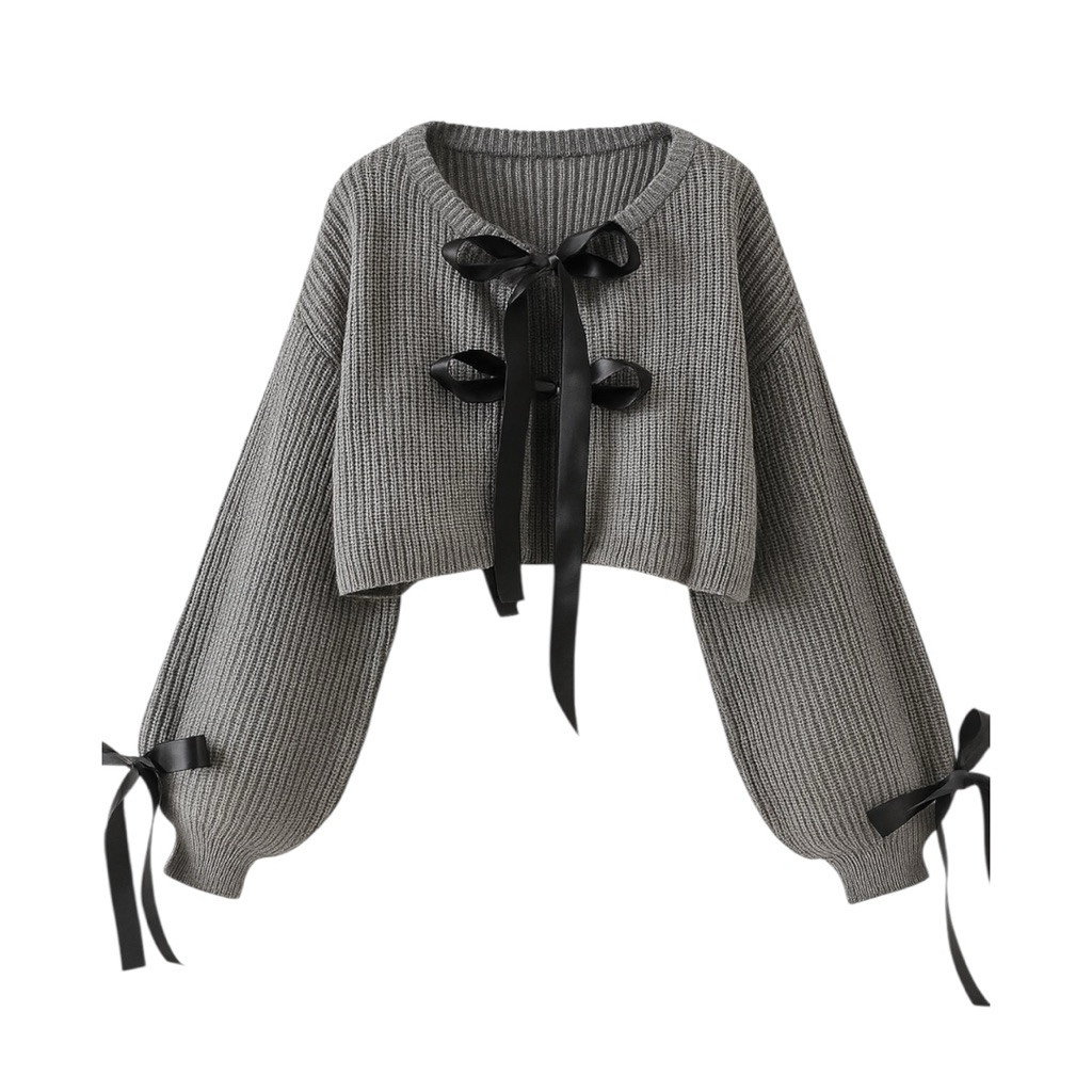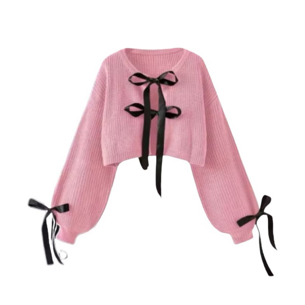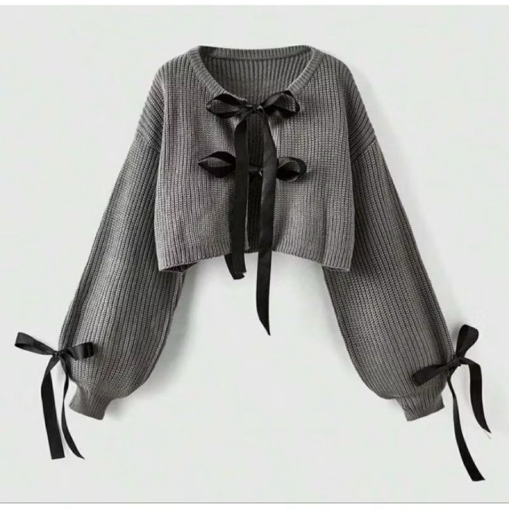 Outer Cardigan Rajut Crop Pita Kekinian | Kardigan Wanita Remaja Korea Style Lengan Balon
