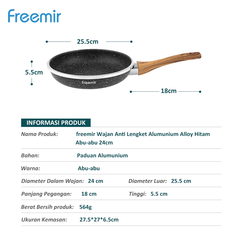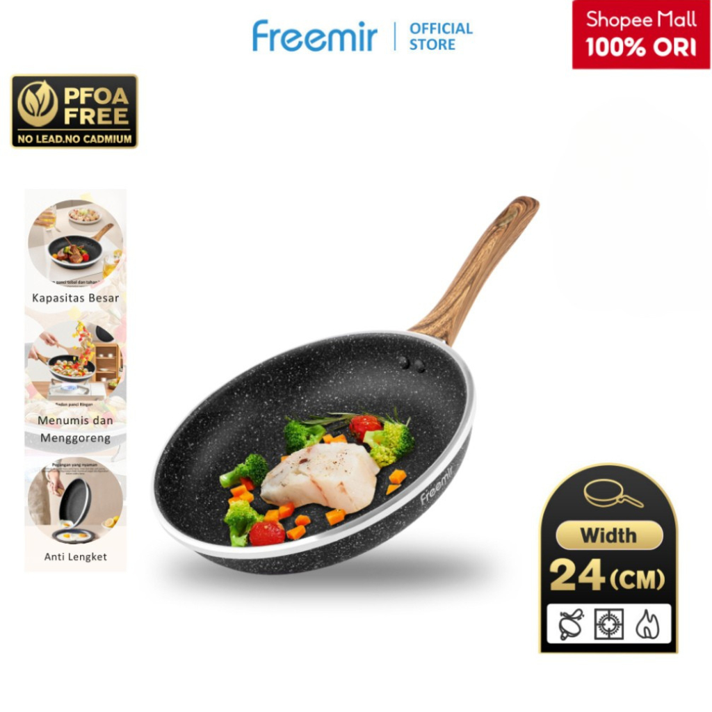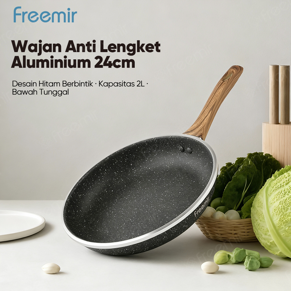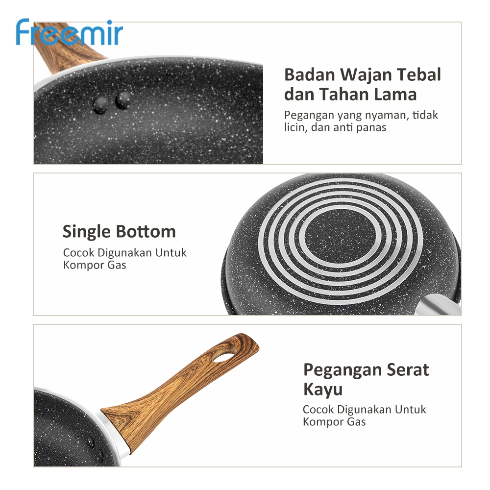 [freemir X Umma Riska] freemir Wajan Penggorengan 24 cm Tebal Anti Lengket Gagang Kayu Serbaguna
