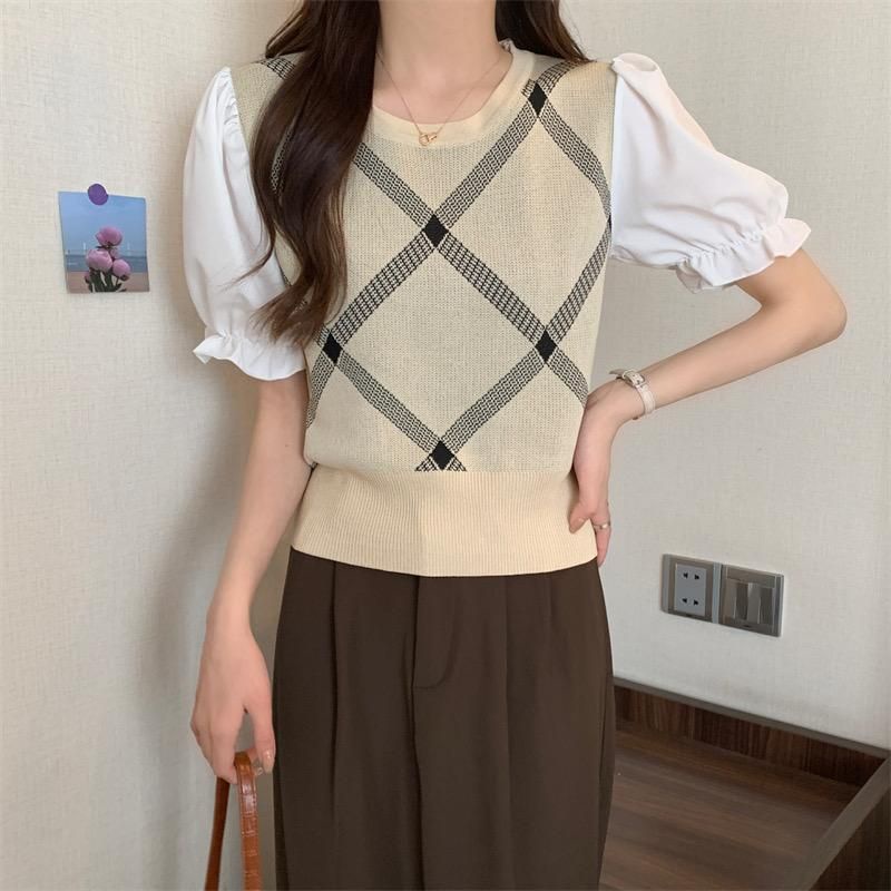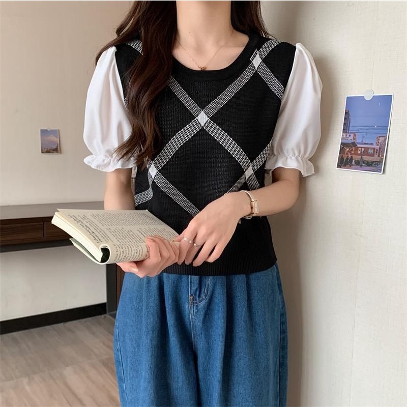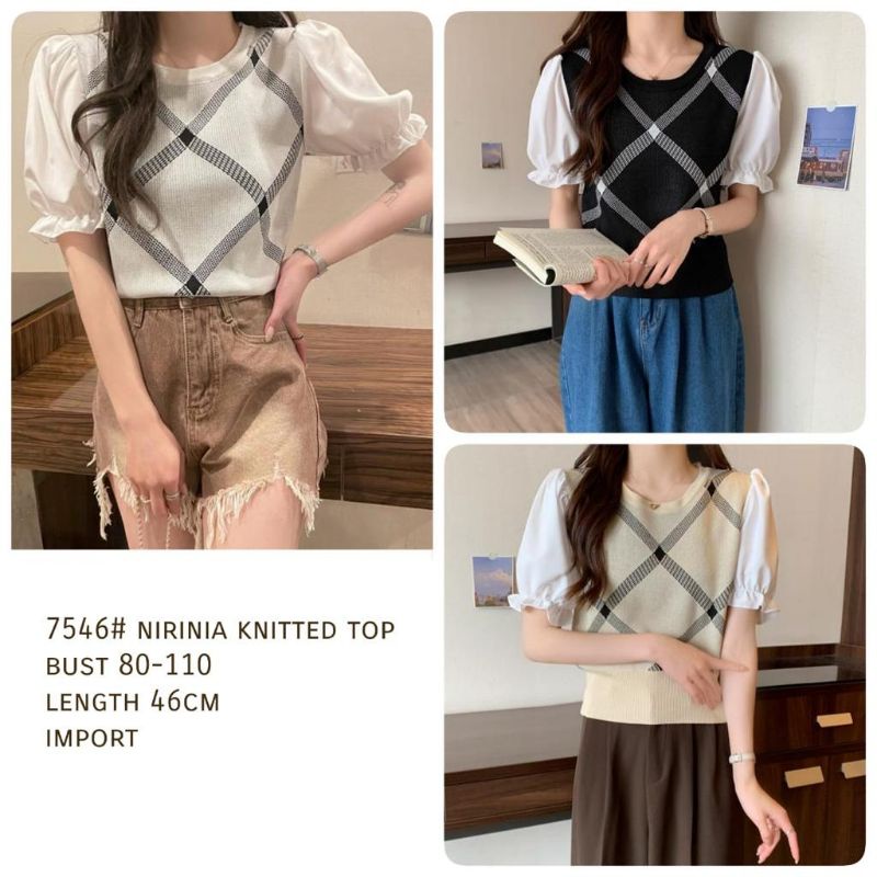 Atasan baju blus blouse kemeja lengan karet pendek croptop krop rajut knit knited kotak lengan polos bahan ngaret melar import premium wanita Kostum baju blus blouse kemeja lengan pendek kotak polos putih hitam cream korean style import premium wanita