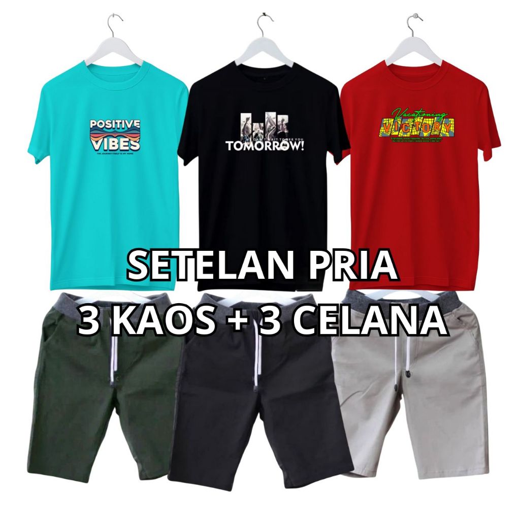 3 Kaos + 3 Celana Paket Hemat 100rb Setelan Baju Pria