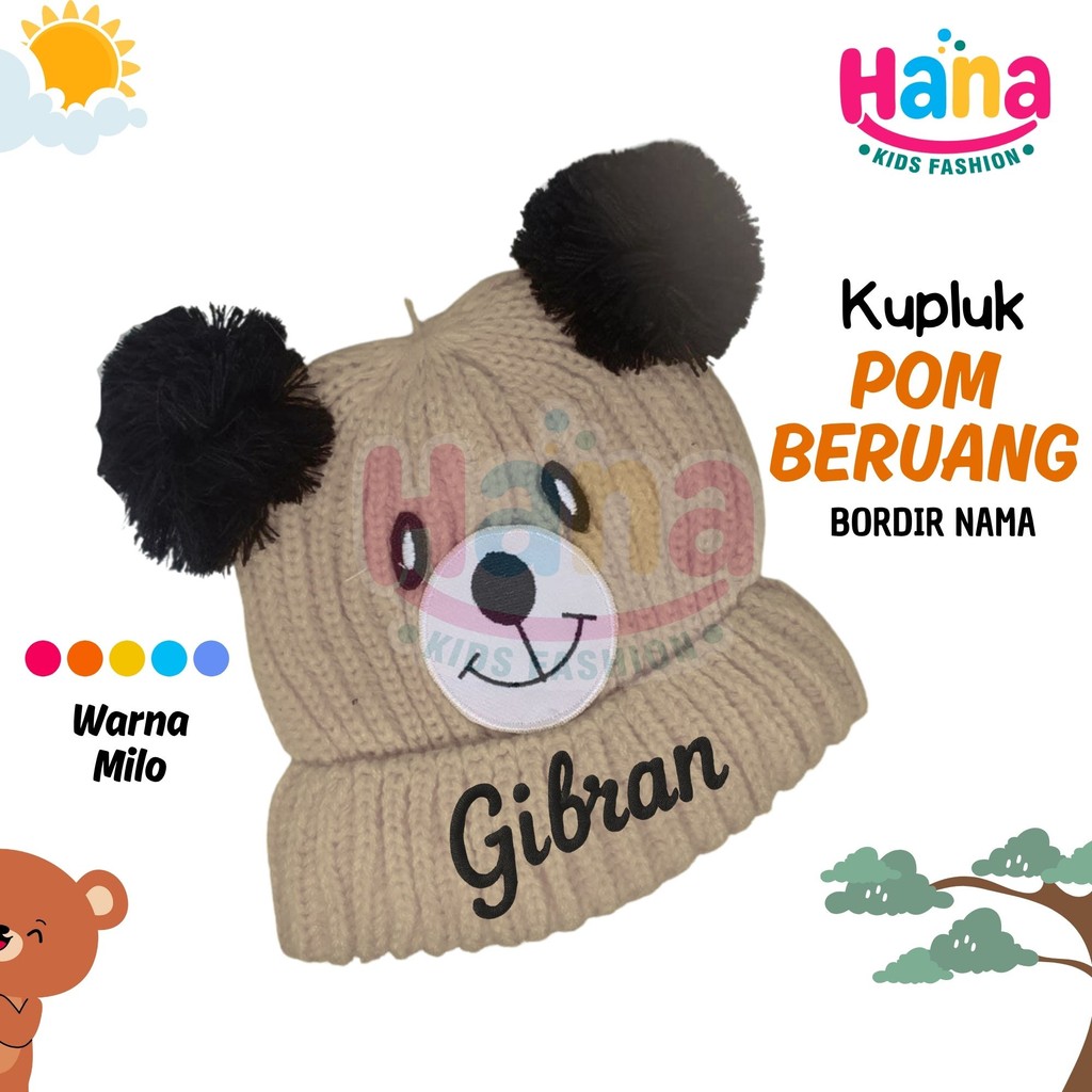 Kupluk Rajut Bayi Pom Pom Beruang Bordir Nama Anak Usia 0-2,5 tahun
