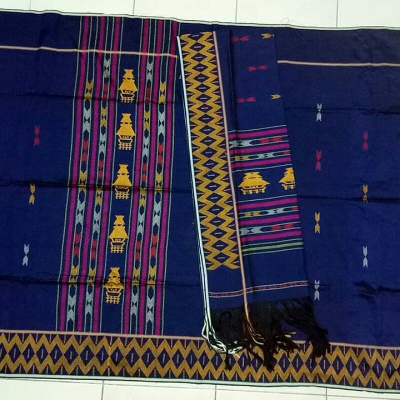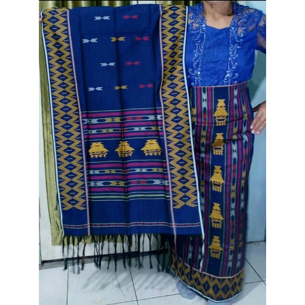 Stelan Rumah Adat, warna biru elektrik, bahan sutra, ringan dan sudah bisa dicuci