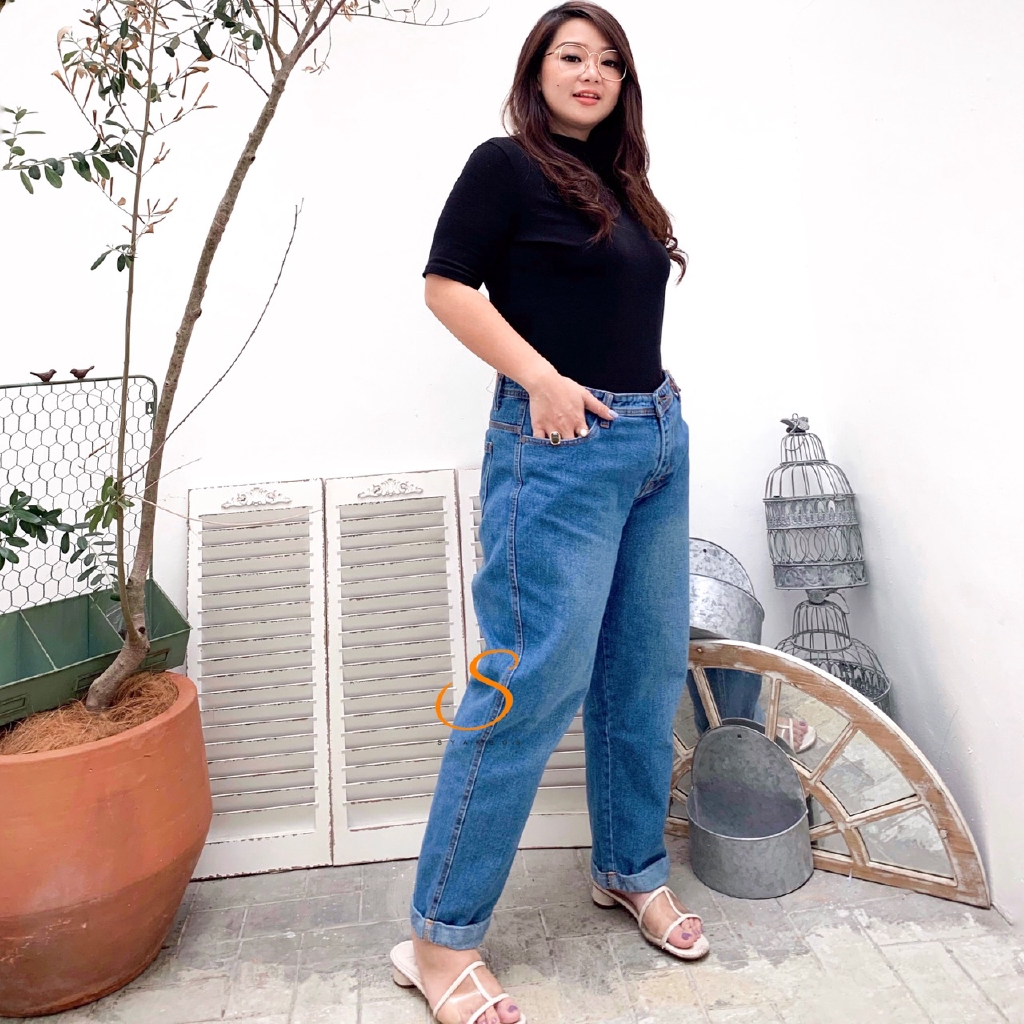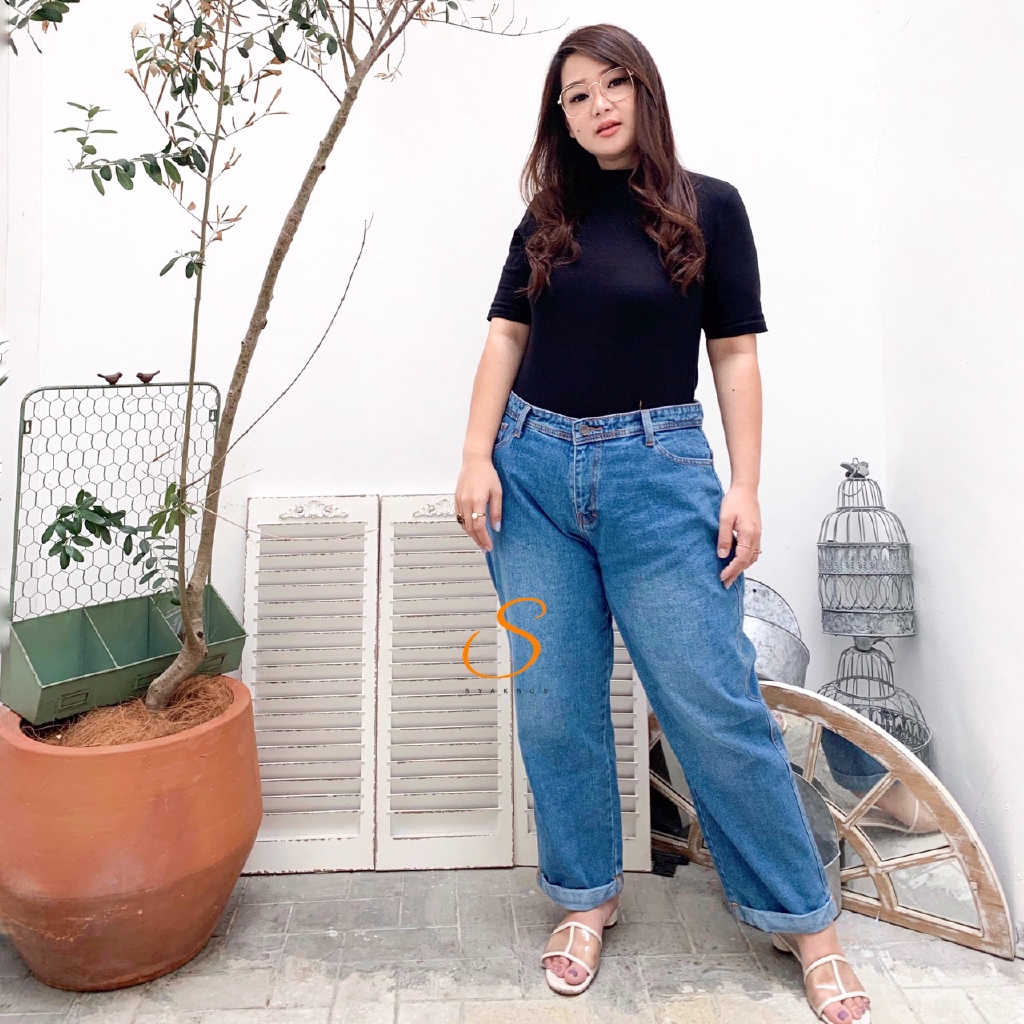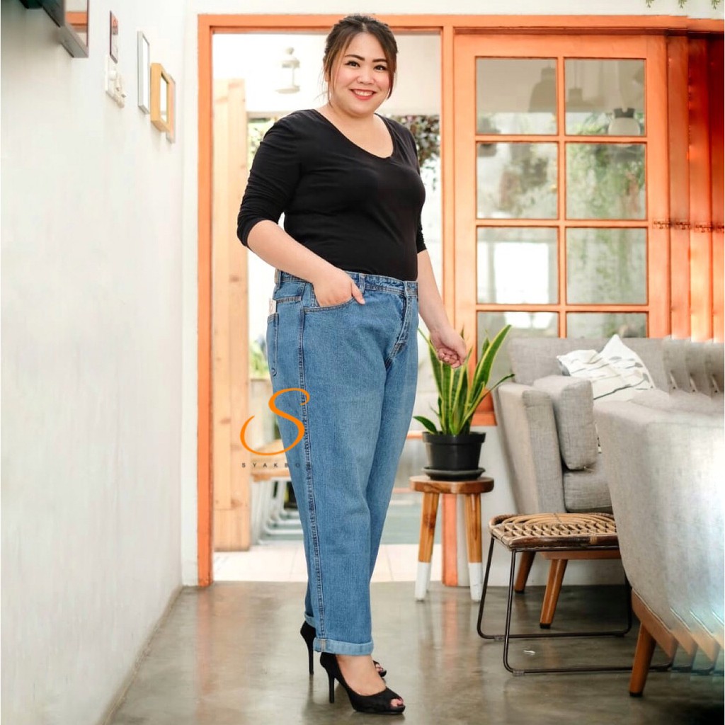 JUMBO BIG SIZE SYAKBOS Highwaist Boyfriend Jeans Wanita Medium Blue