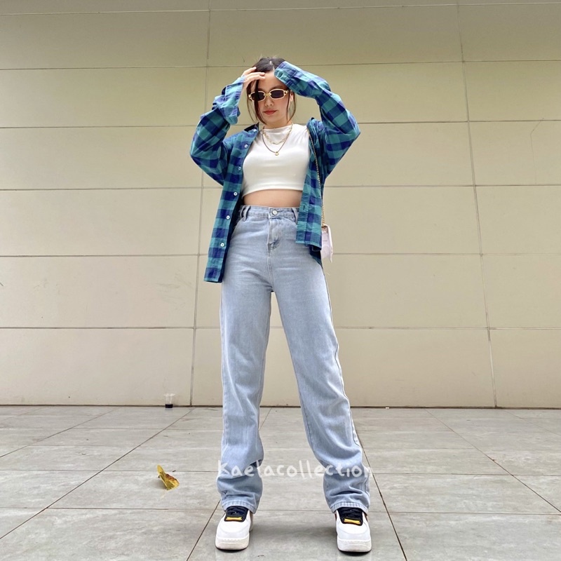 Mauve Jeans in Light Blue - Celana Basic Baggy Highwaist Straight Denim Blue Jeans Celana Panjang Wanita