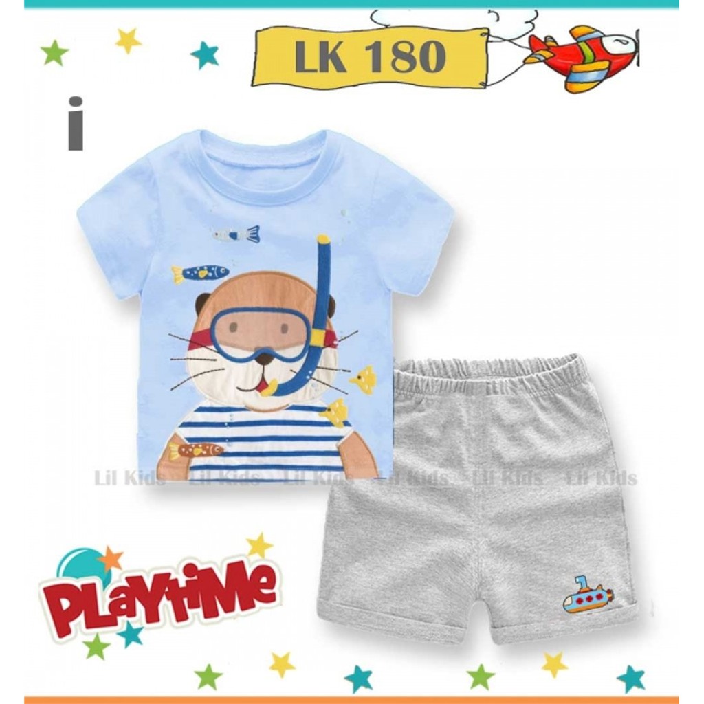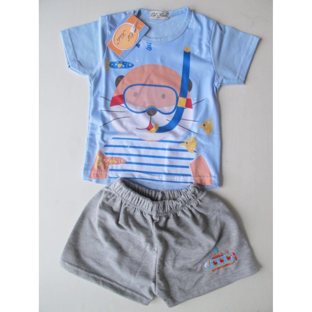 Baju Setelan Anak Cowo Motif Kucing Kaos Anak Warna Biru Muda Baju Santai Anak Laki-laki Playsuit