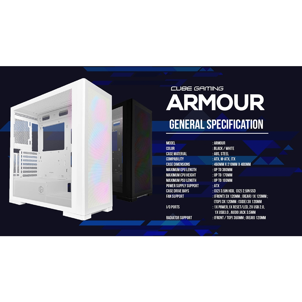 CASING CUBE GAMING PREMIUM ARMOUR - Mid Tower ATX Case Tempered Glass (Free 3x RGB Fan)