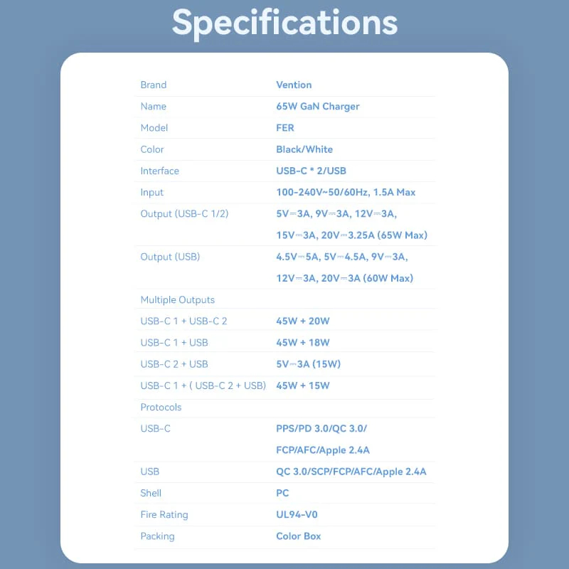 VENTION ADAPTOR CHARGER GaN 65W USB-A Type-C Fast Charging PD QC Triple Port (USB-C*2/USB-A) - FERB0-EU