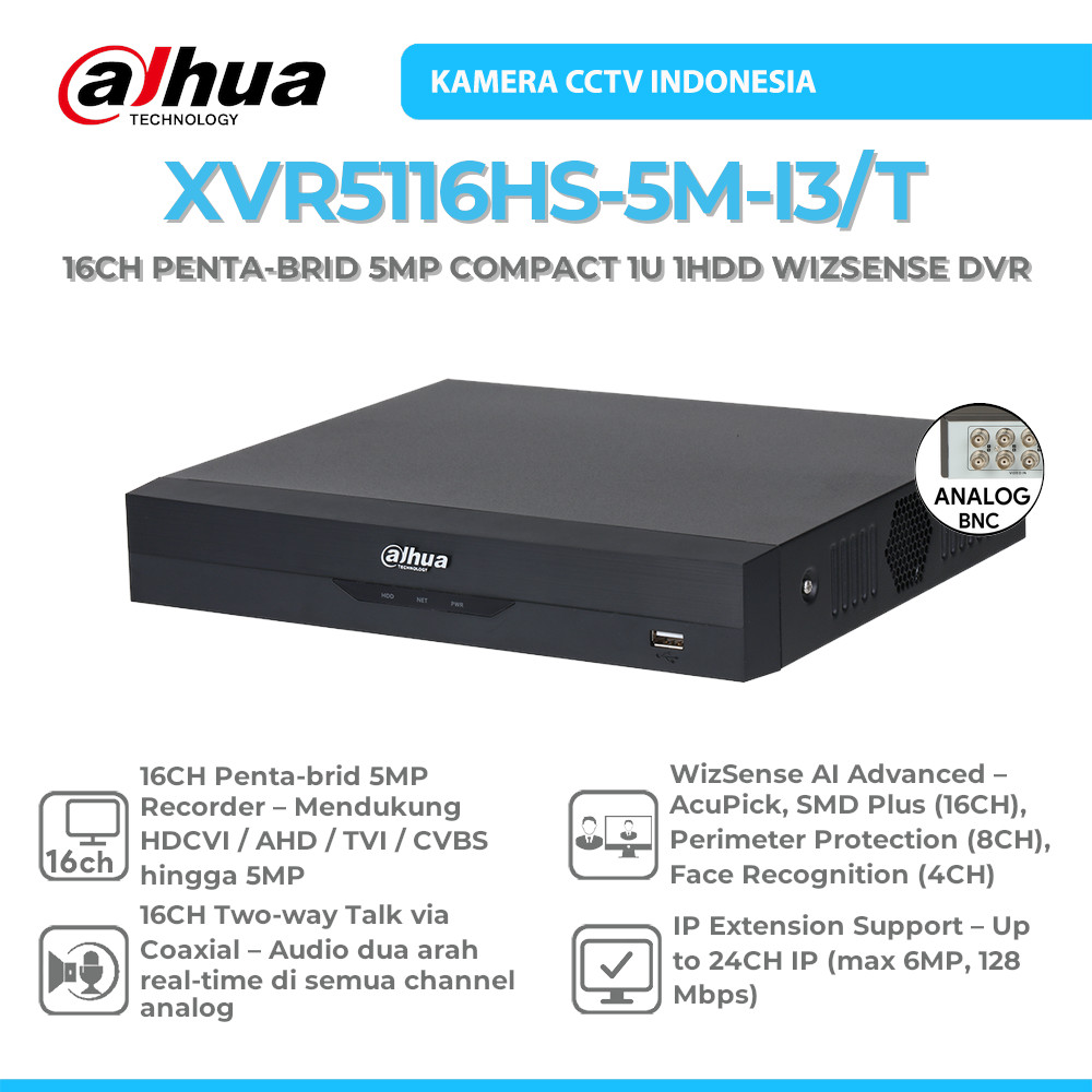 DAHUA XVR5116HS-5M-I3/T 16CH PENTA-BRID 5MP COMPACT 1U 1HDD WIZSENSE DIGITAL VIDEO RECORDER