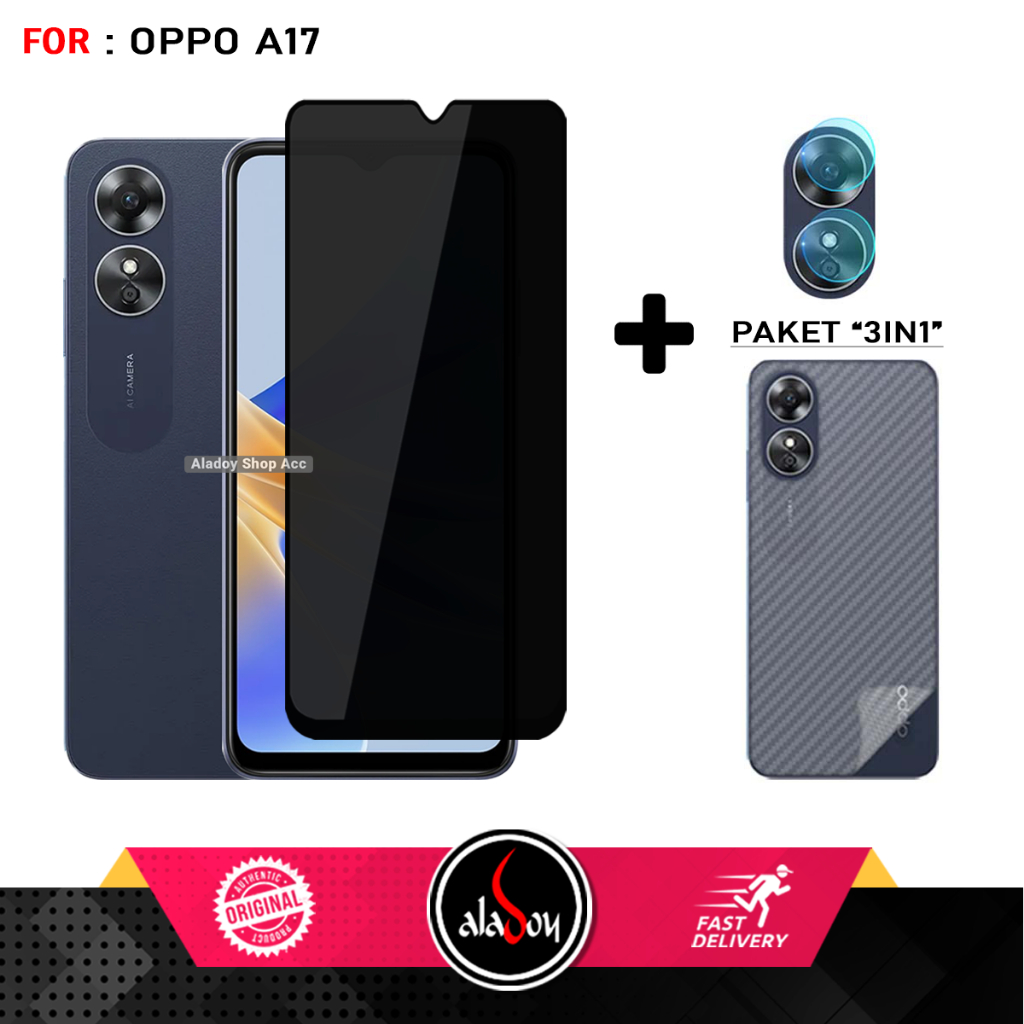 Paket 3in1 Tempered Glass Layar Anti Spy Privacy Oppo A17 Free Anti Gores Camera dan Garskin Carbon