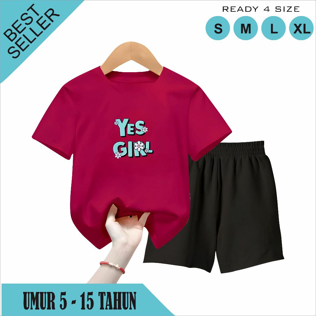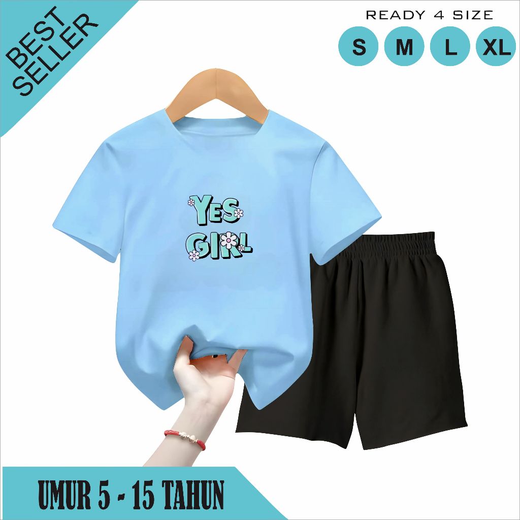 Setelan Celana Pendek Anak 5-15 Tahun Motif Yes Girl