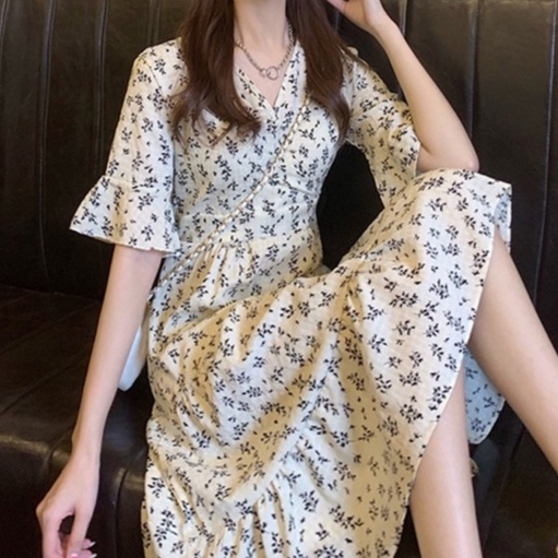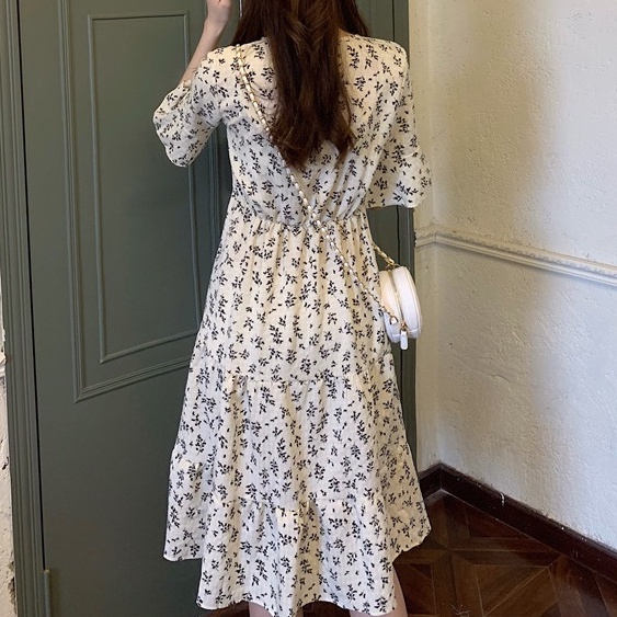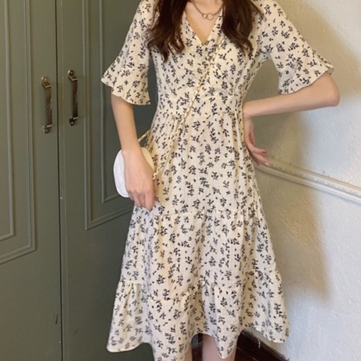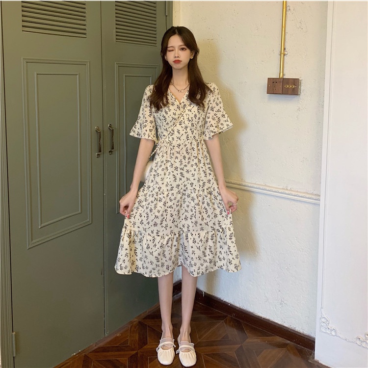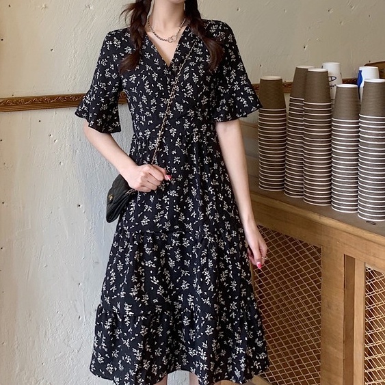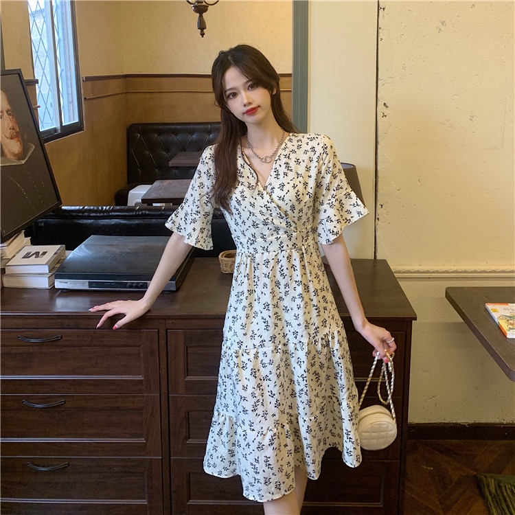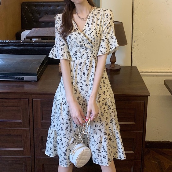 V Neck Short Sleeve A Line Floral Midi Dress 2854 (S/M/L)
