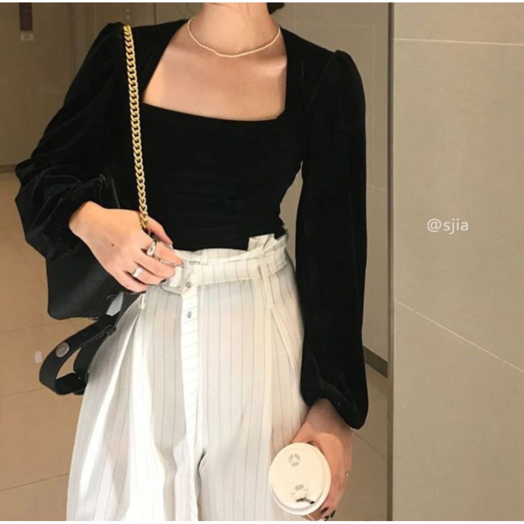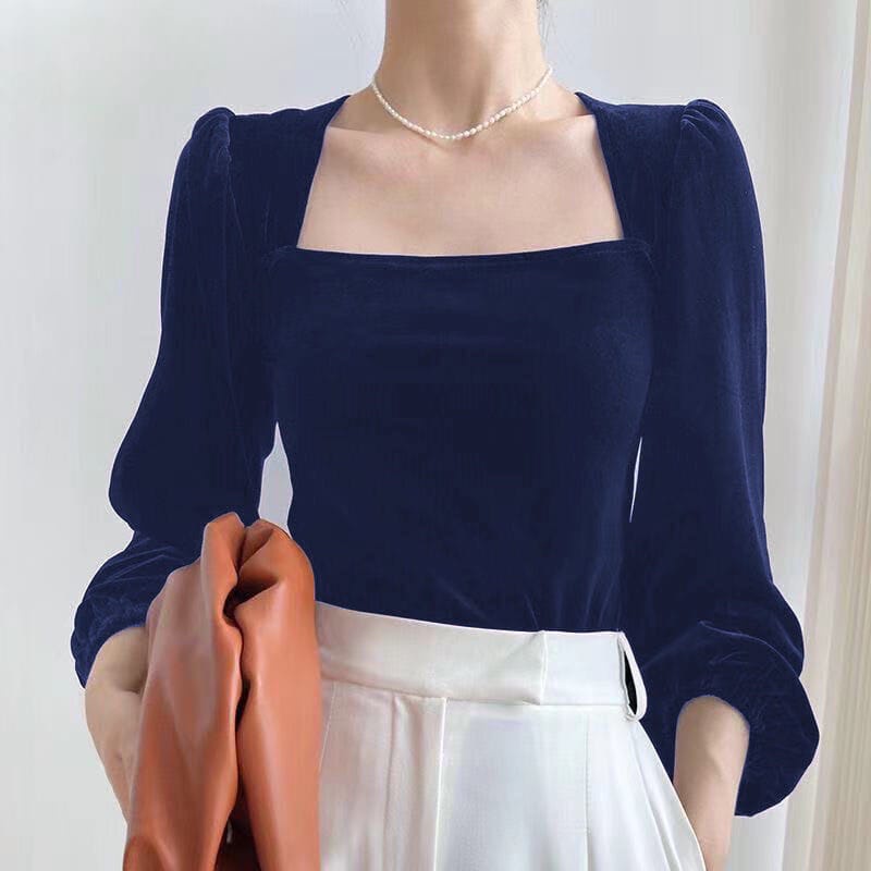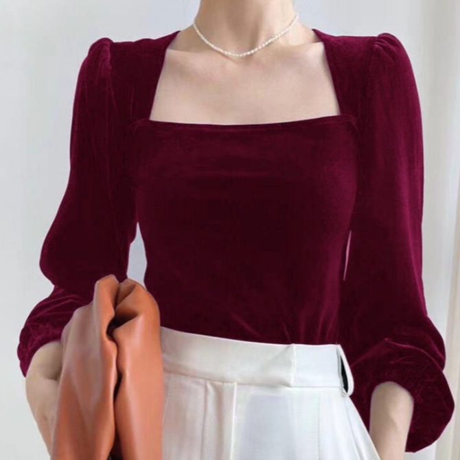 Elegant Square Neck Long Puff Sleeve Velvet Top Blouse 1150(S/M/L/XL)