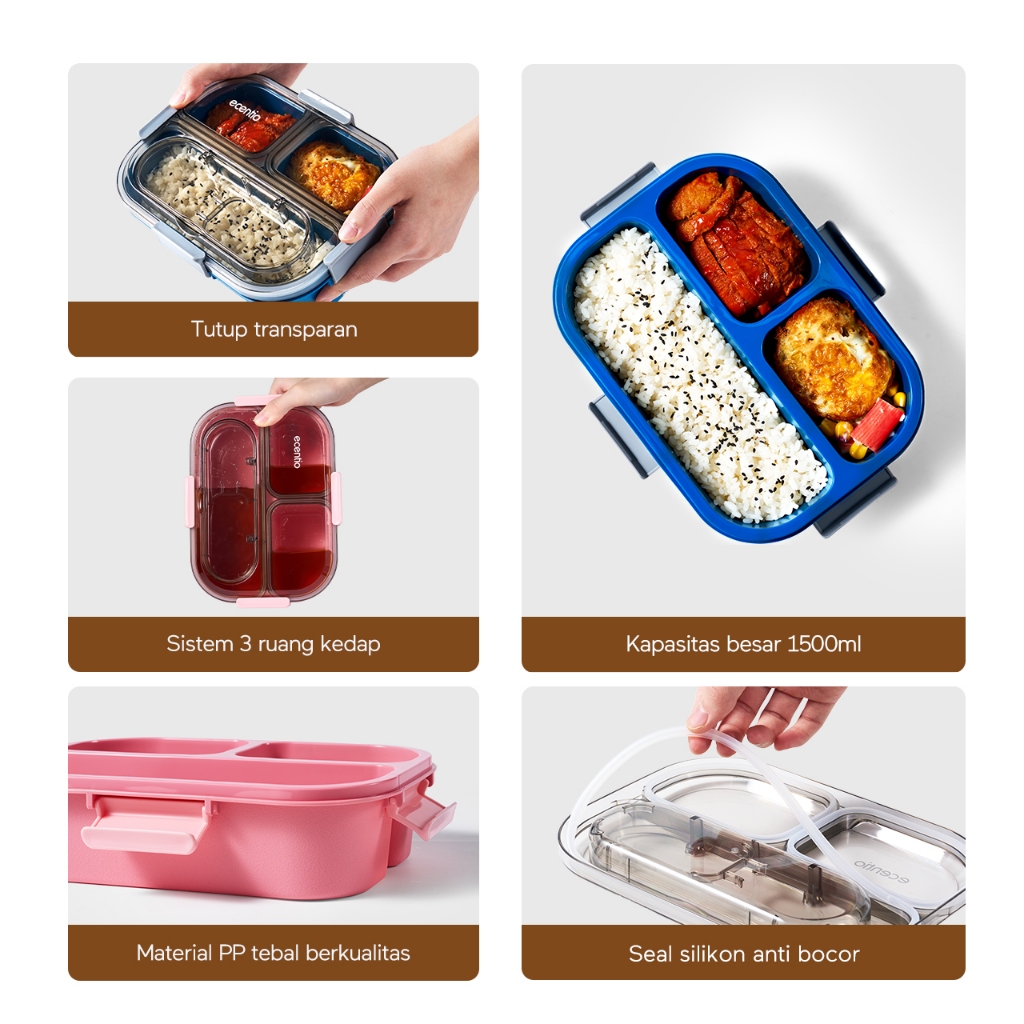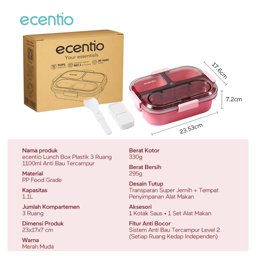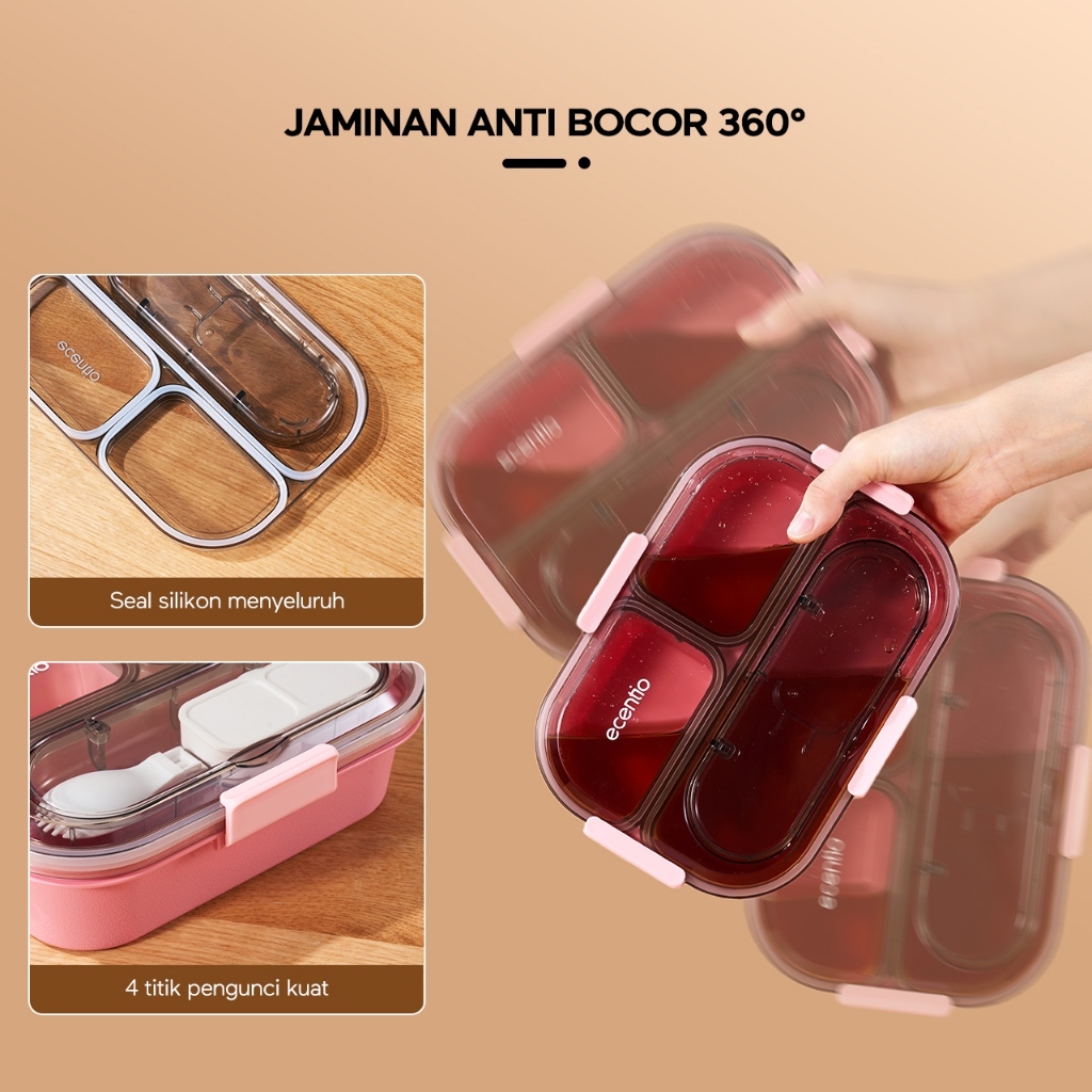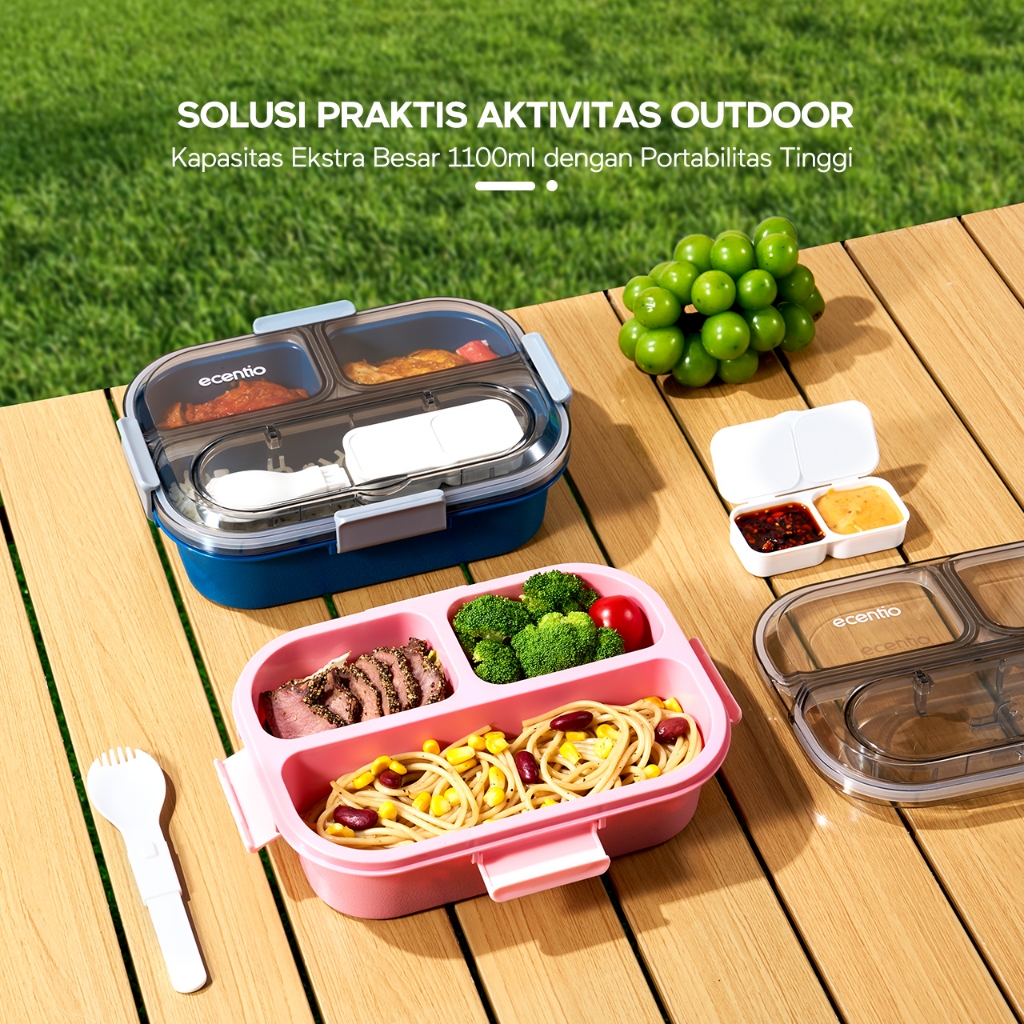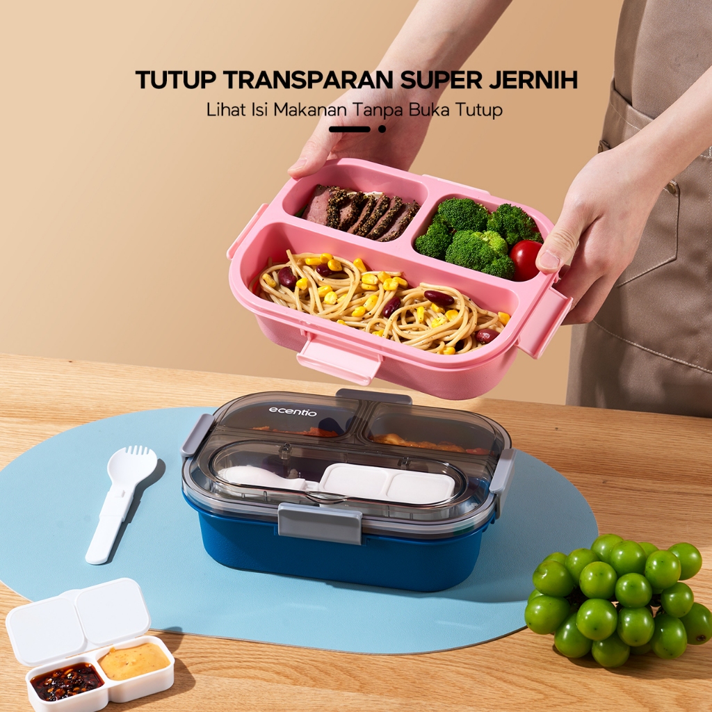 [Live Exclusive]ecentio lunch box 2.0 anti tumpah kotak bekal anti tumpah 1100ml 3 gird lunch box set free sendok kotak saus BPA FREE PP tebal berkualitas Solusi outdoor dan office