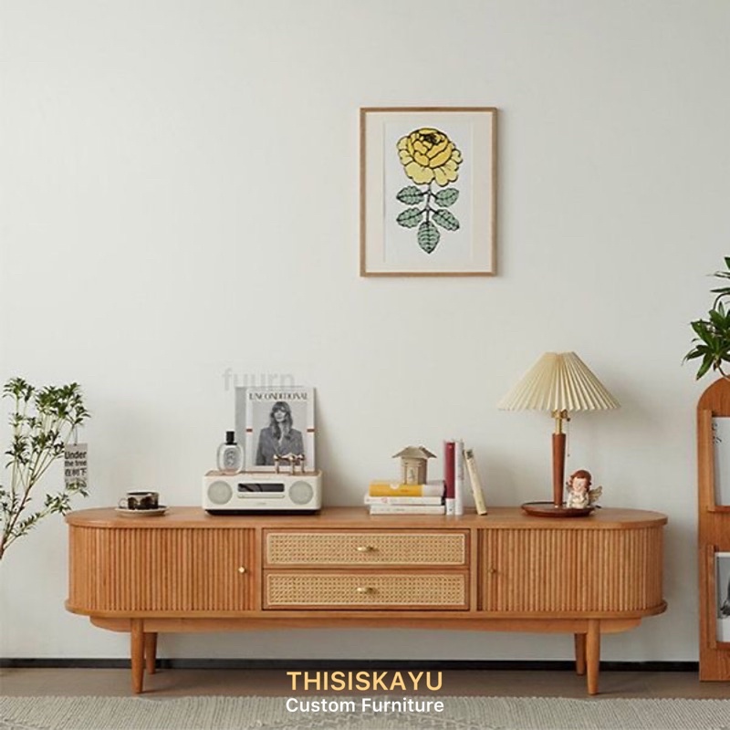 BUFFET TV KAYU JATI ASLI DENGAN ANYAMAN ROTAN MINIMALIS NATURAL KAYU JAPANSE STYLE | BUFFET GAYA JEPANG KAYU | KABINET KAYU JATI NATURAL MINIMALS VINTAGE MODERN ELEGANT KEKINIAN
