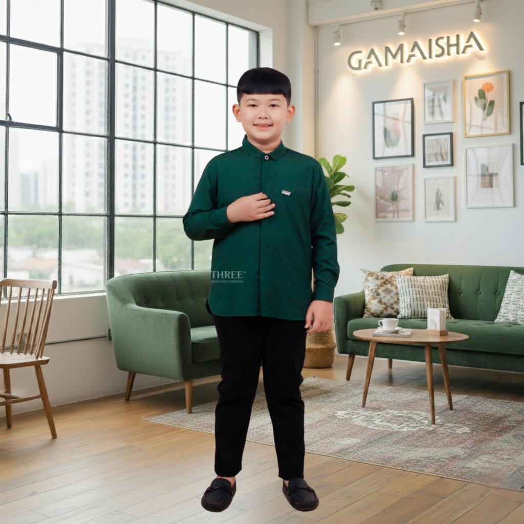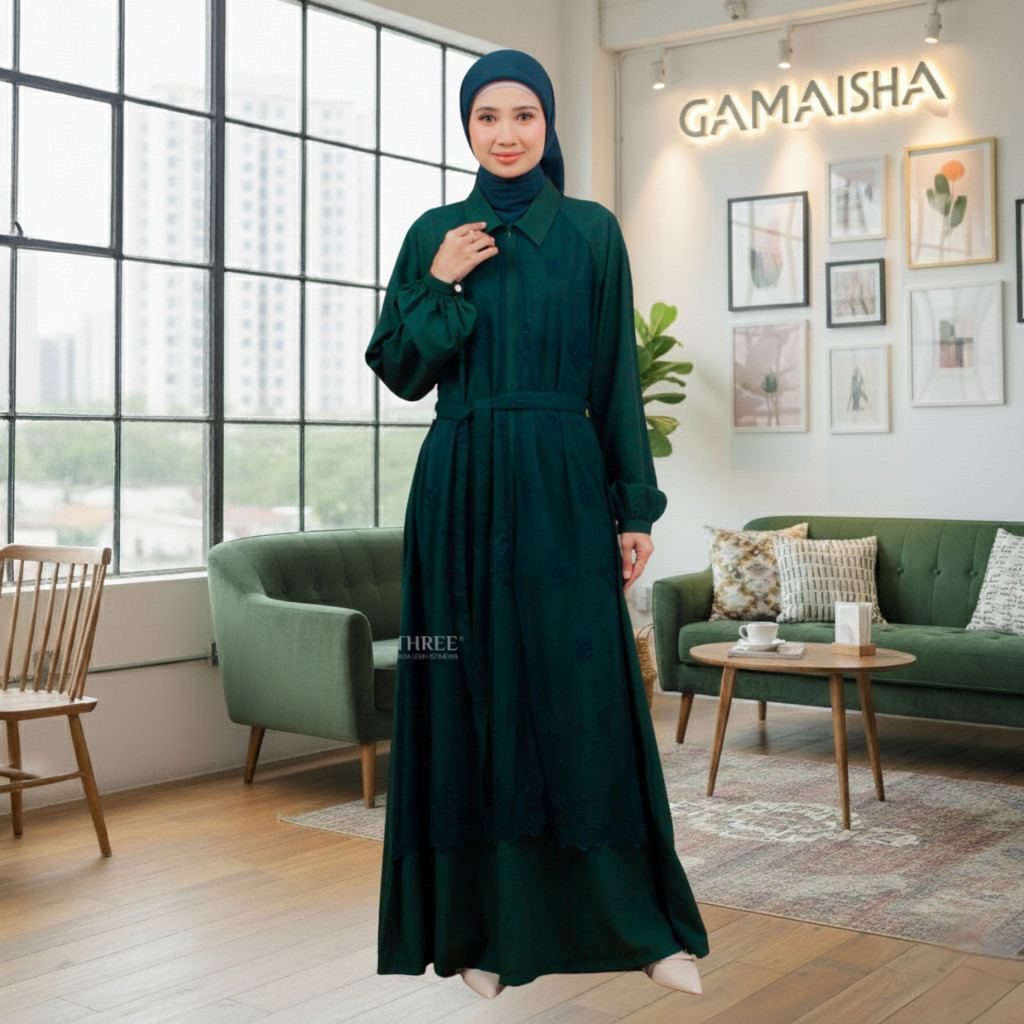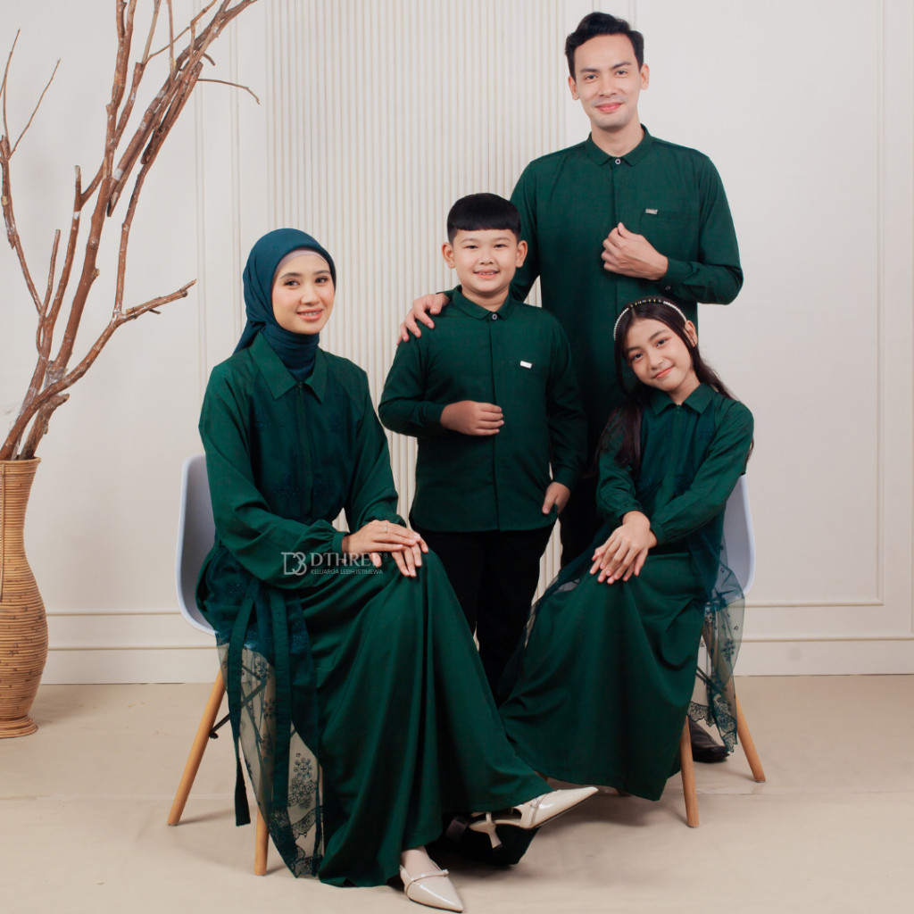 Couple Keluarga 2026 Sarimbit Set Lebaran Nameera Hijau Botol Dress Raya Baju Family