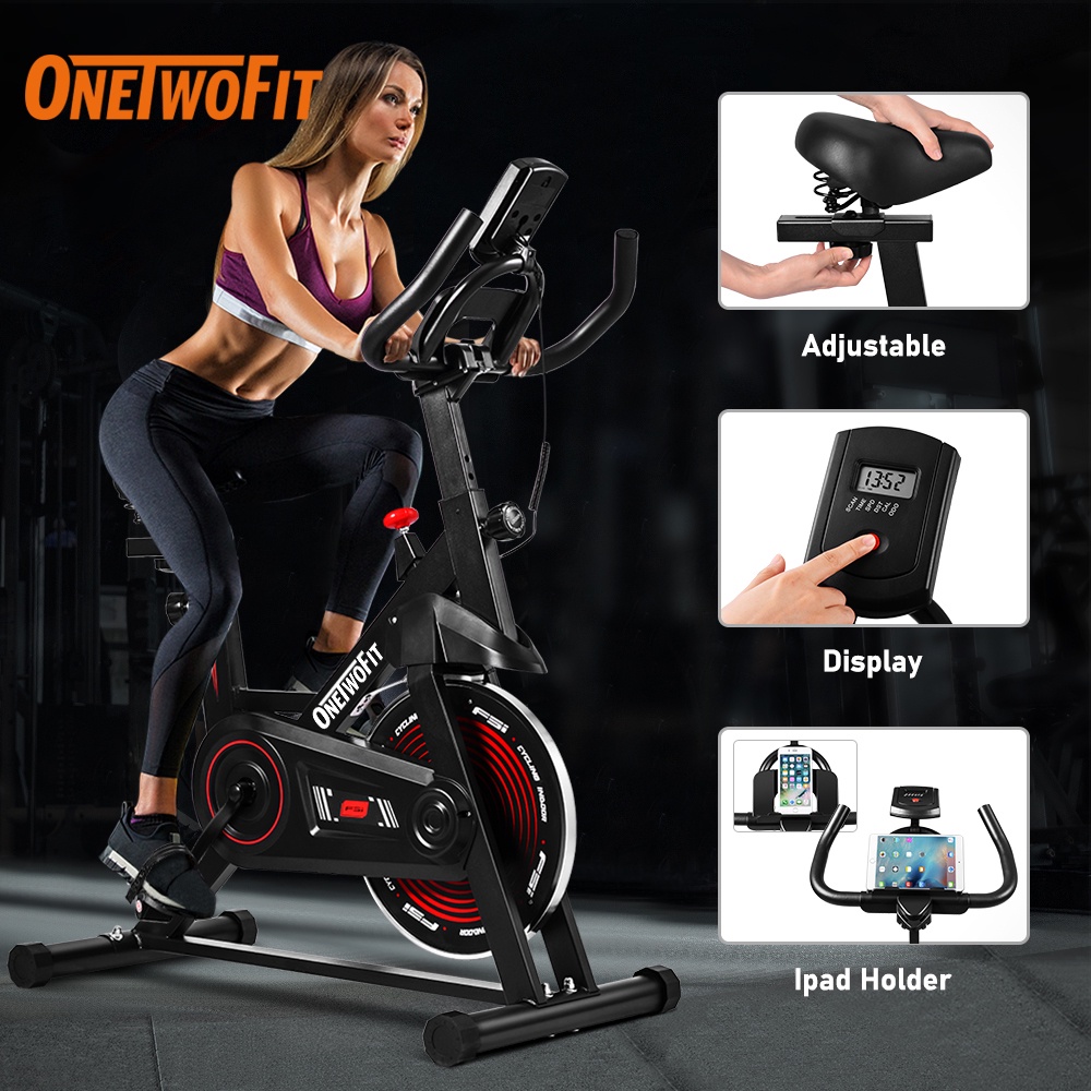 OneTwoFit Sepeda Statis Fitness Spinning Bike Hitam & Merah dengan Monitor LCD Ketinggian Kursi Adjustable Dudukan Multifungsi Bisa Berolahraga Sambil Menonton Video Beban Maks 150kg Kursi