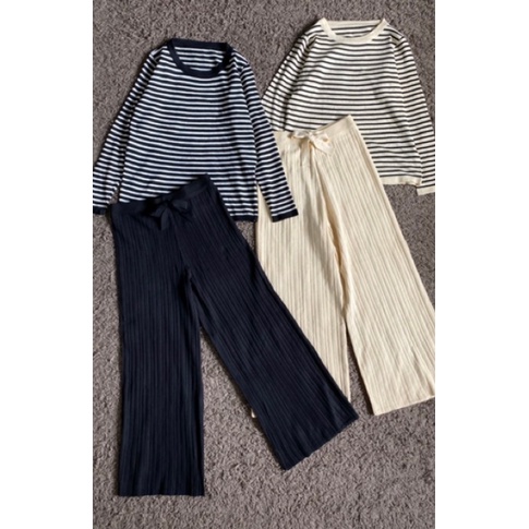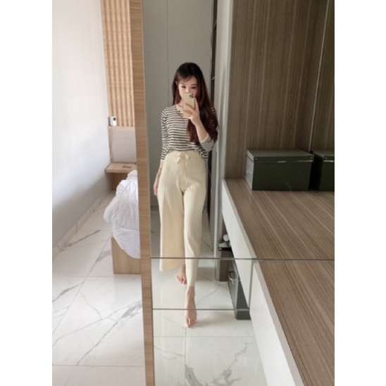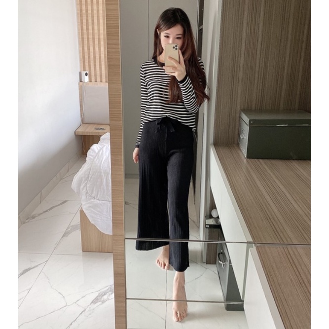 Setelan Celana Panjang Wanita Kulot garis garis 969 ndudshop ( hitam/cream)
