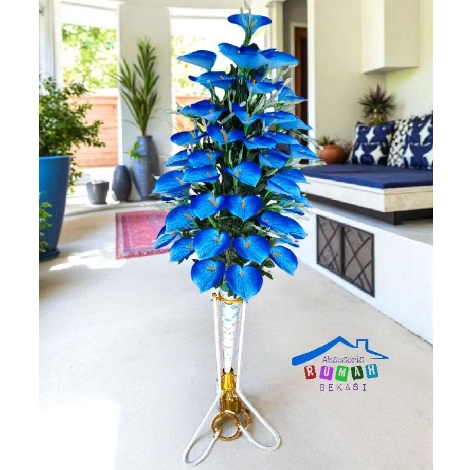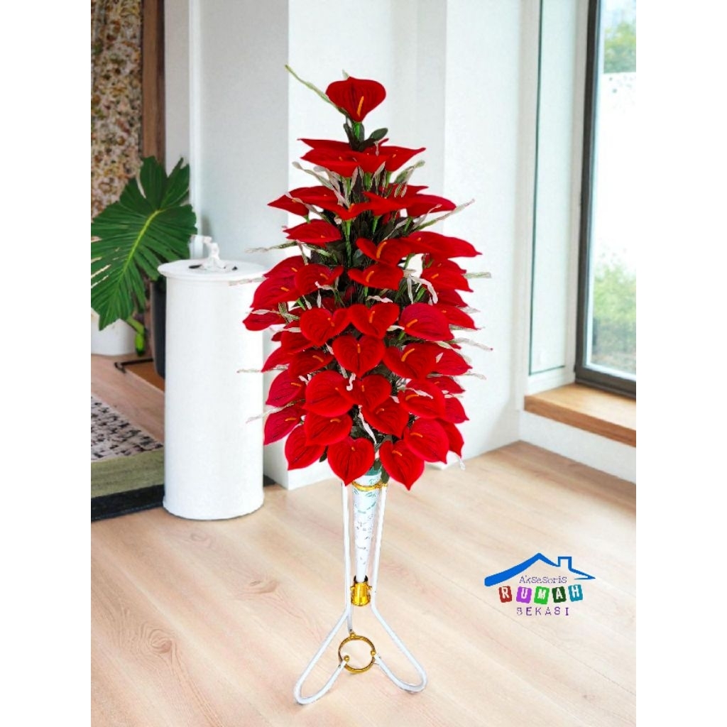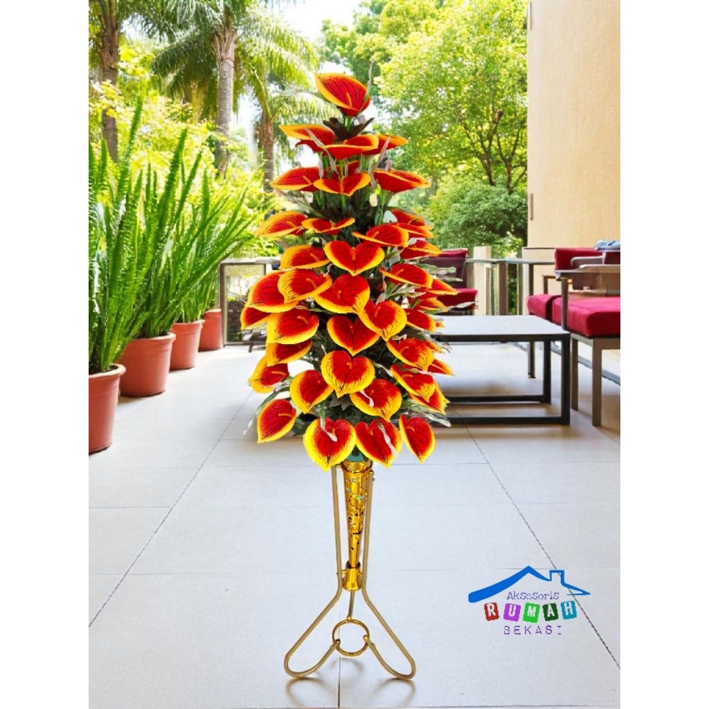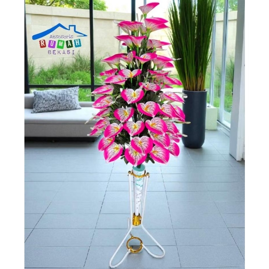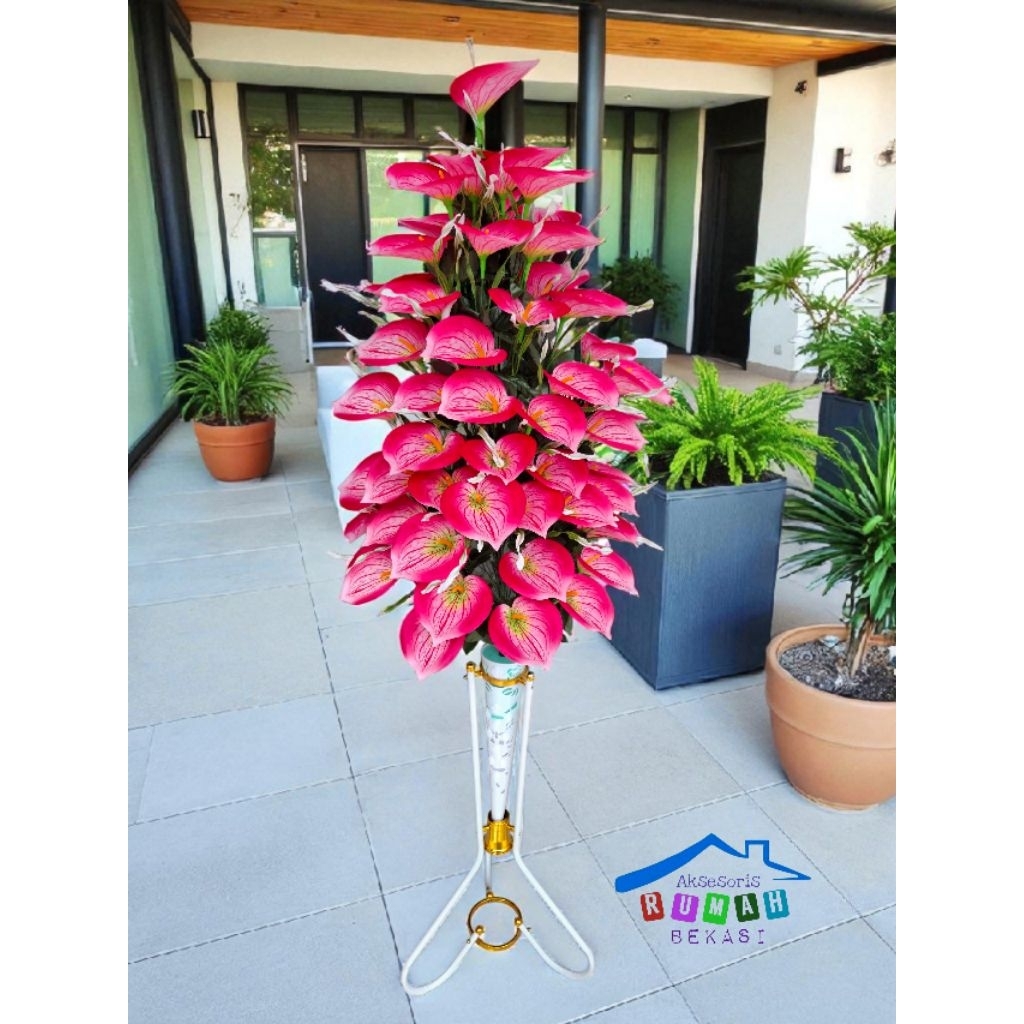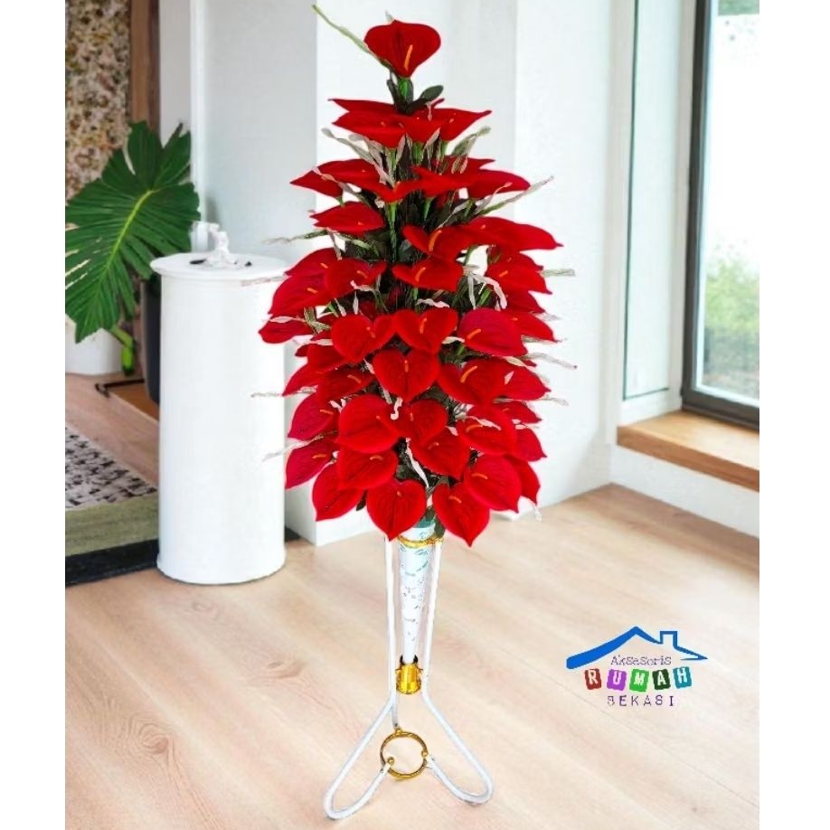 HIASAN RUMAH BUNGA ANTHURIUM LILY ARTIFICIAL 60 KUNTUM DENGAN POT STANDING BESI