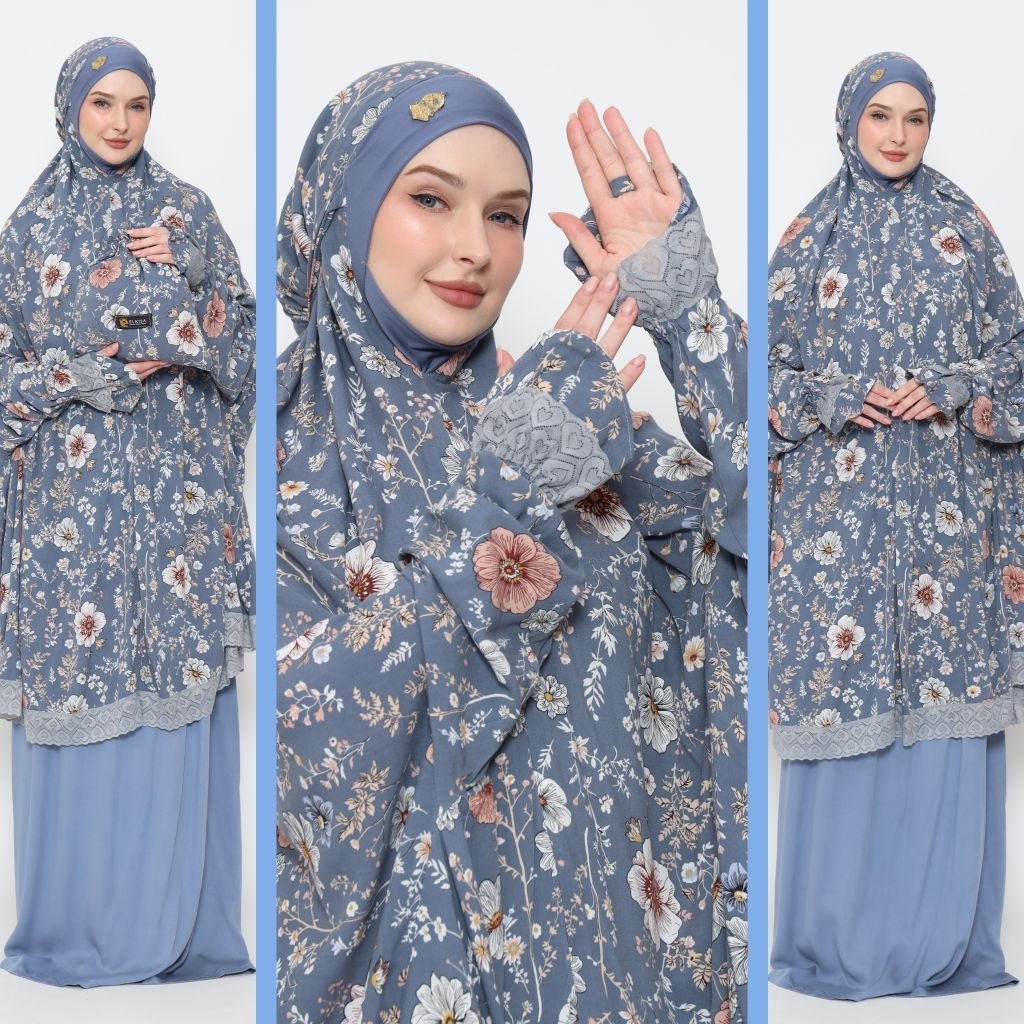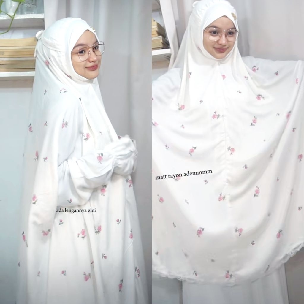 Mukena Khadijah Rayon by Elkisa/mukena Faeyza by Elkisa/ mukena setelan berlengan/mukena setelan/mukena atas bawah berlengan/mukena Malaysia/mukena menutup dagu/mukena rayon/mukena renda/mukena putih
