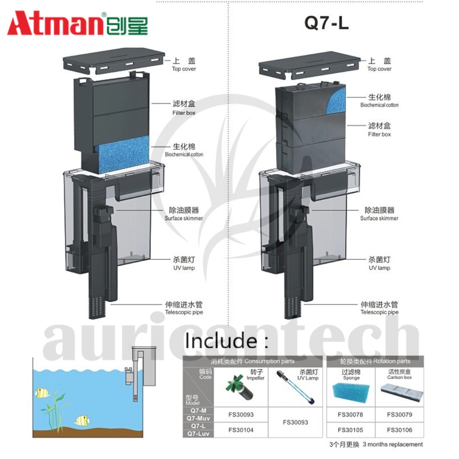 Atman Hang on Q7-M 850 L/H With UV 7 WATT Q7 M Filter Gantung Aquarium