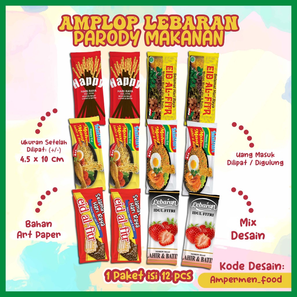 Amplop THR Bentuk Permen - [1 Paket isi 12 pcs] - AMPLOP THR BENTUK UNIK - AMPLOP / ANGPAO BENTUK BUNGKUS PERMEN - Tema HAPPY LEBARAN IDUL FITRI PARODY BUNGKUS MAKANAN