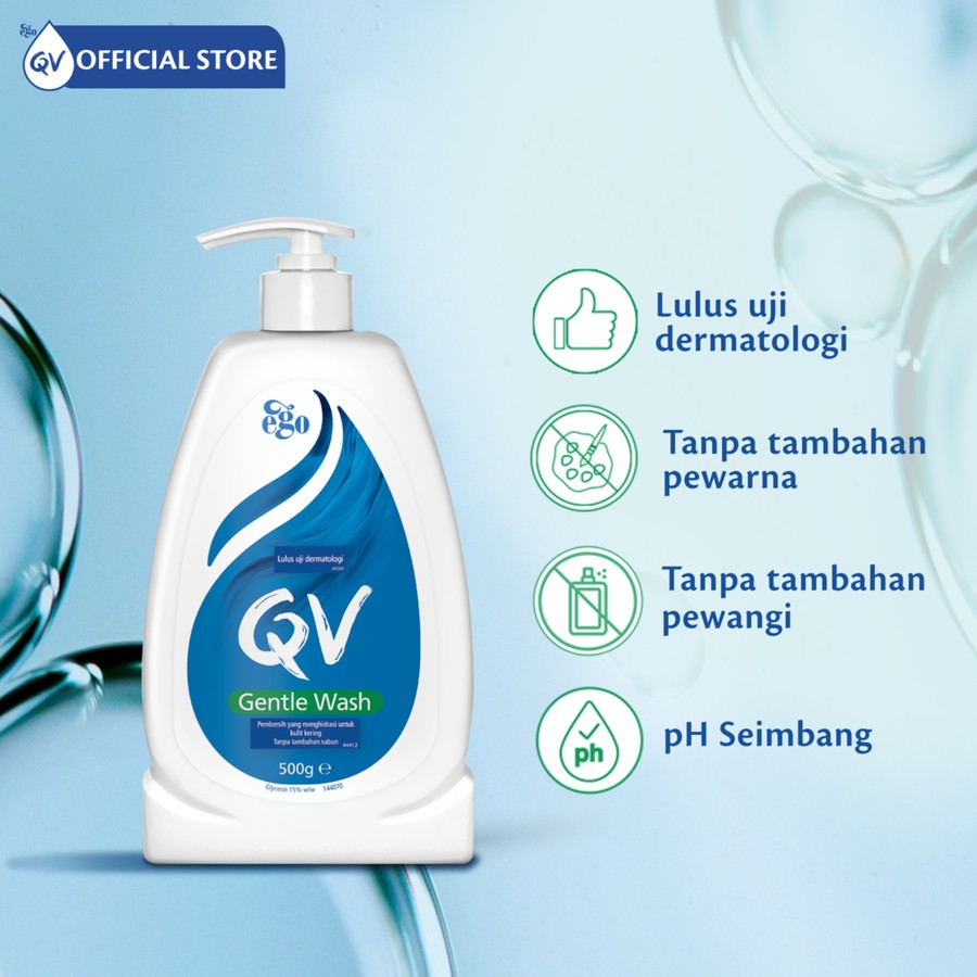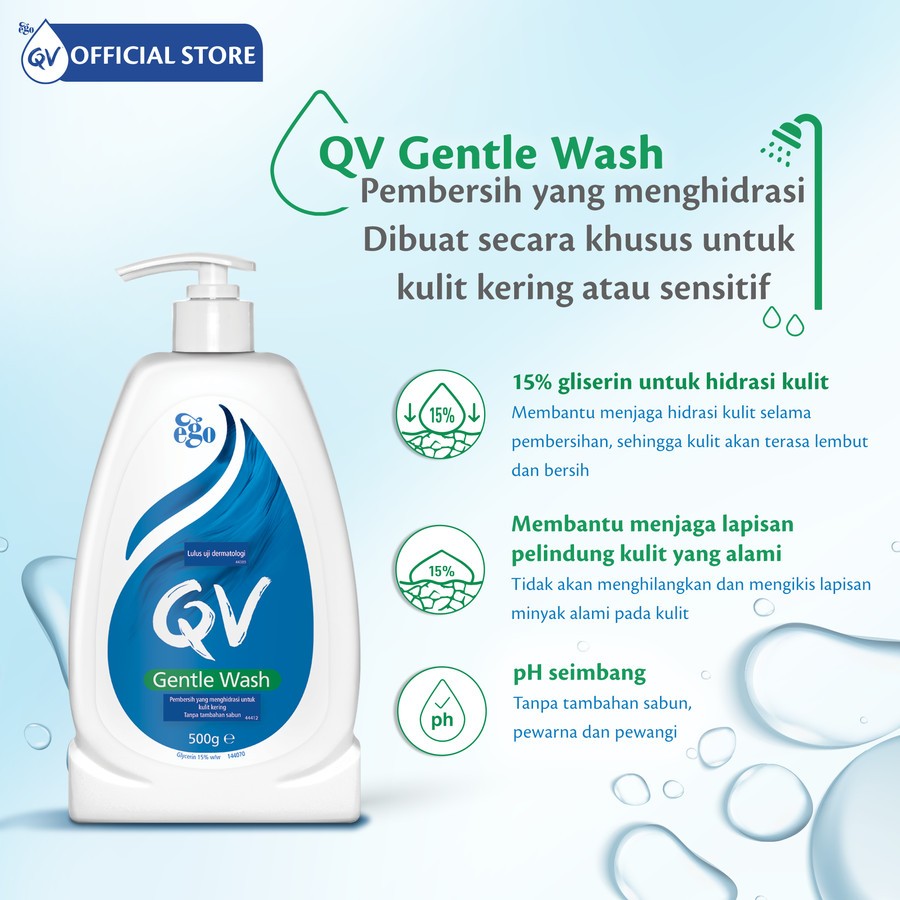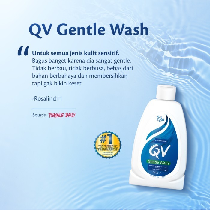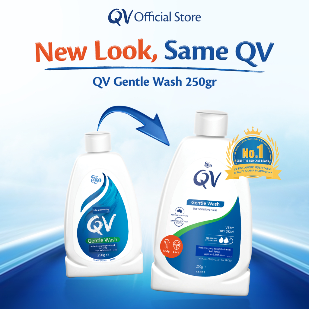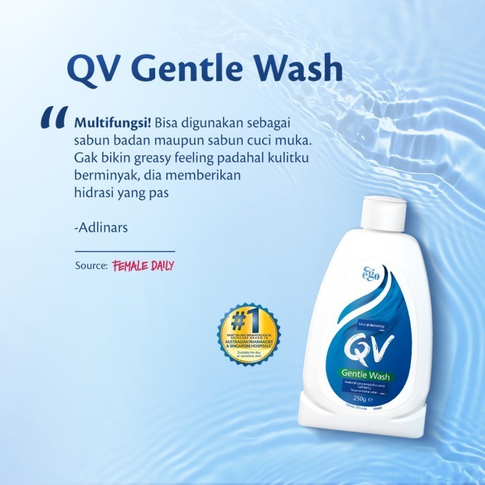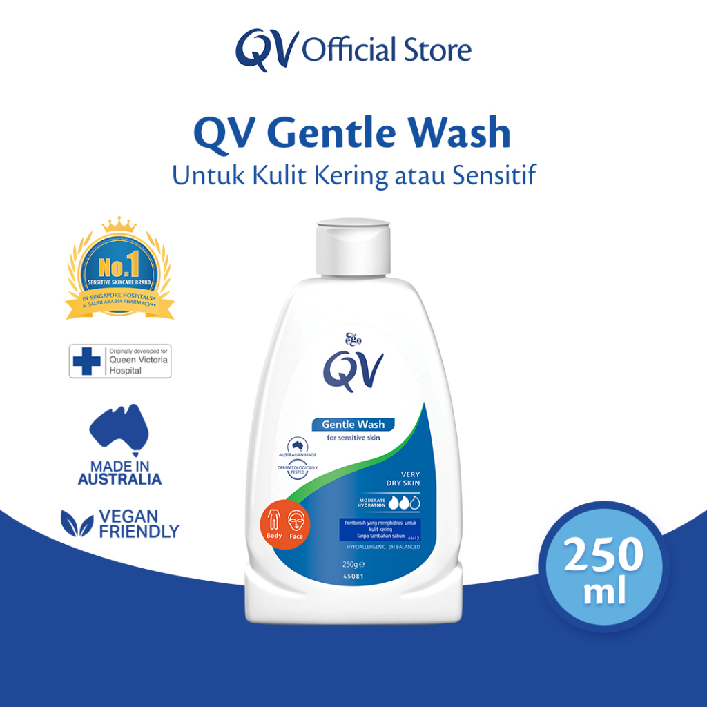 QV Gentle Wash 250ml. Pembersih tubuh untuk kulit kering dan sensitif. Tanpa tambahan sabun, dengan 15% Glycerin dan pH seimbang