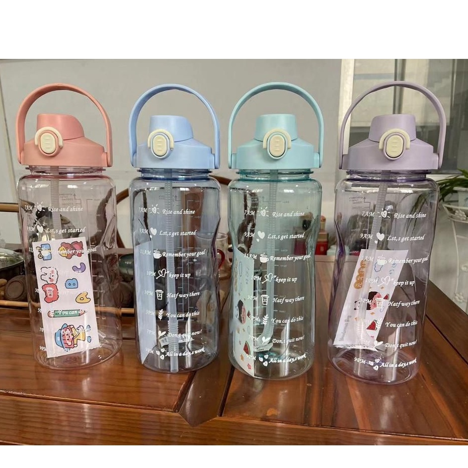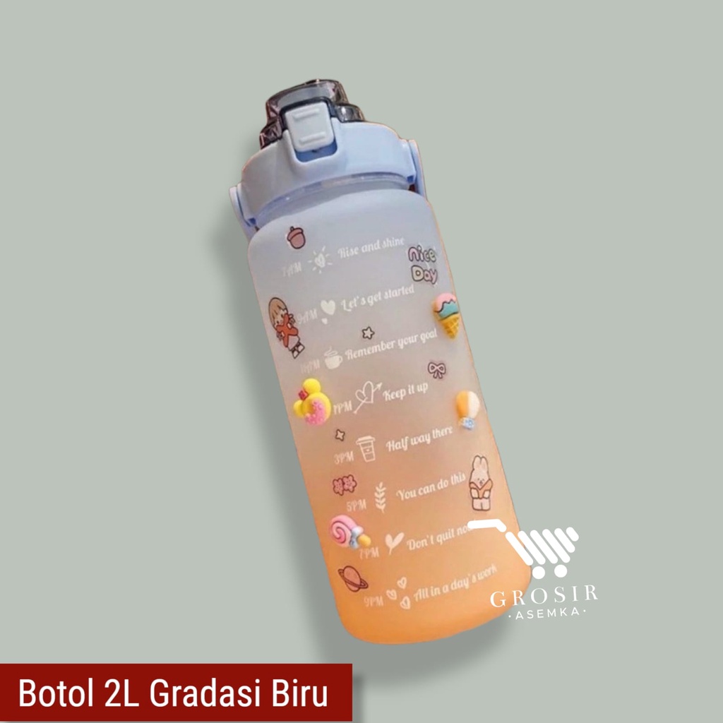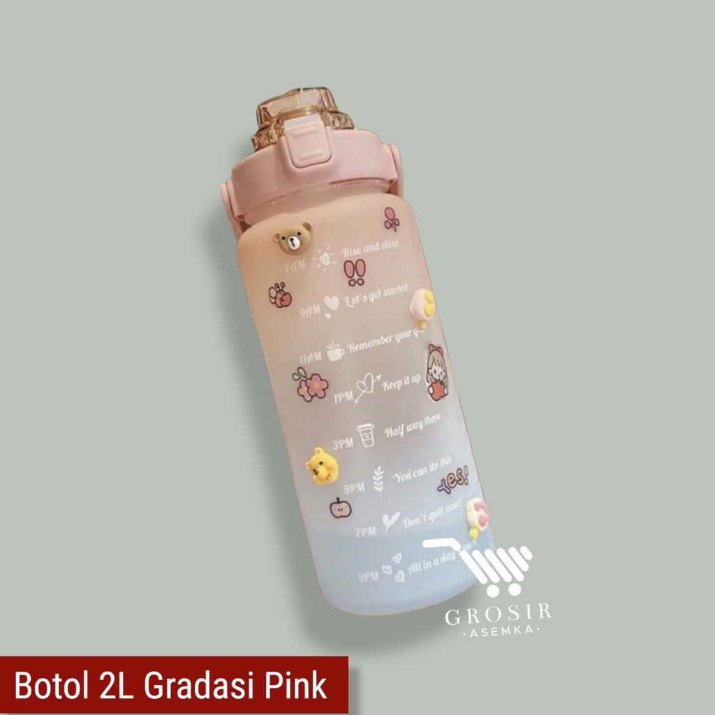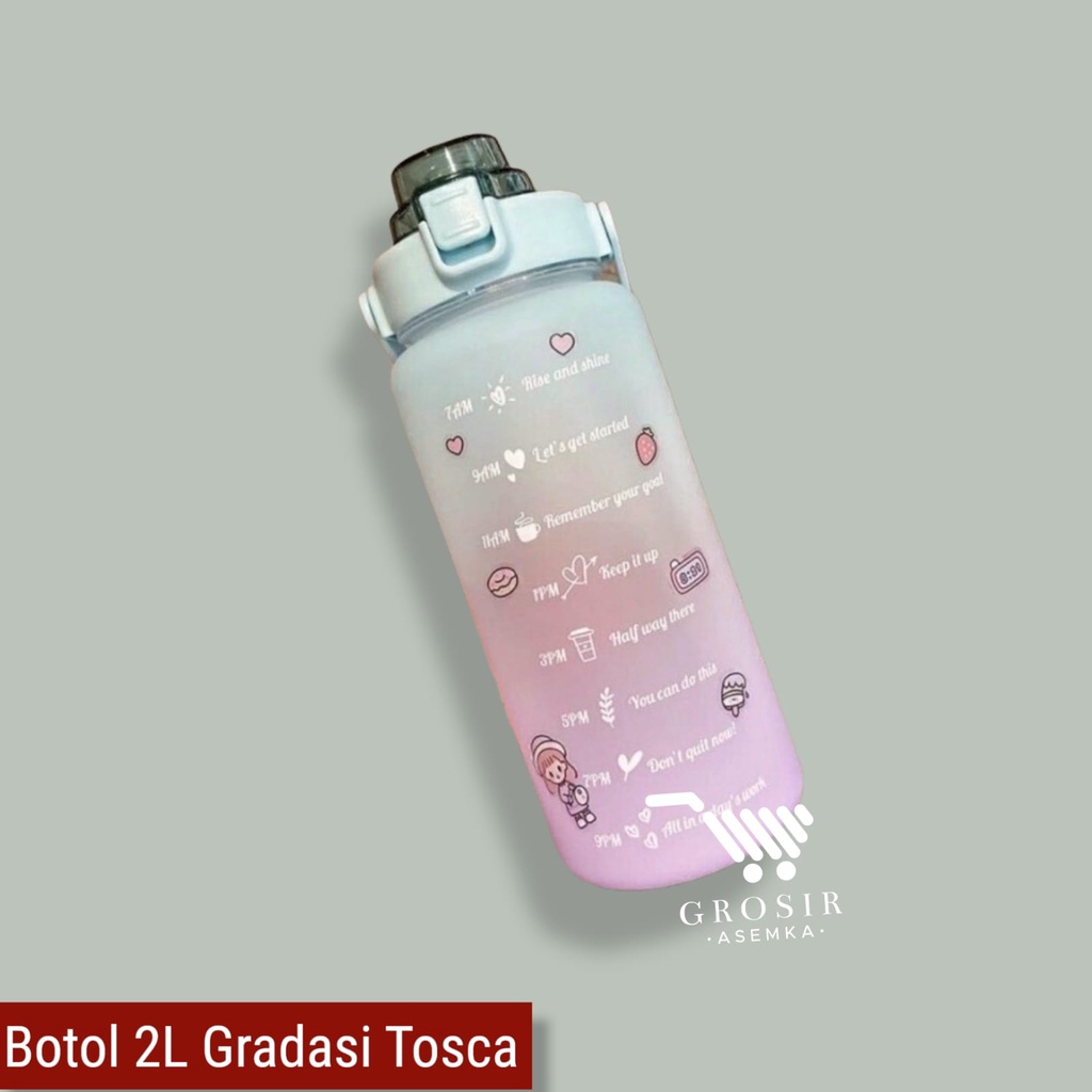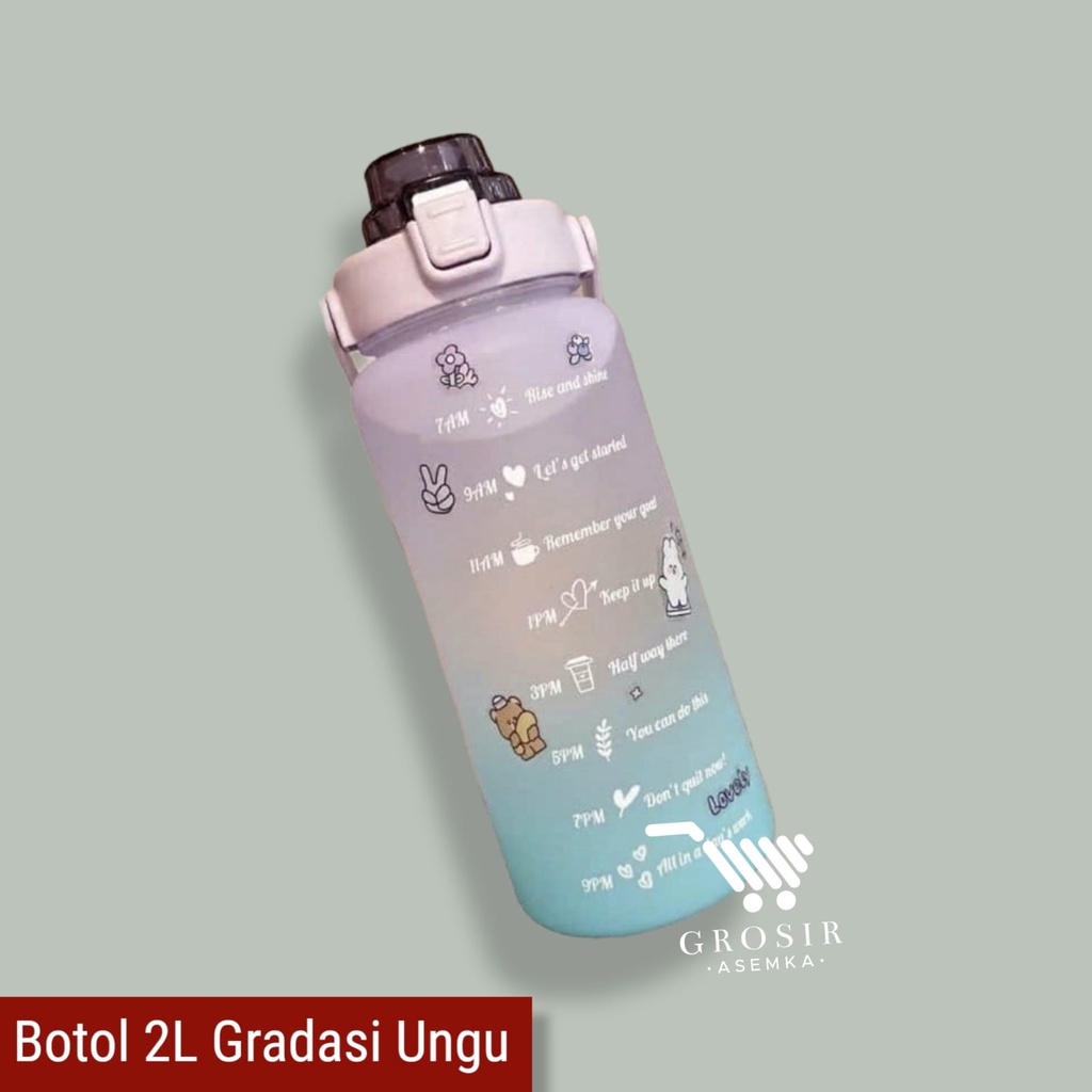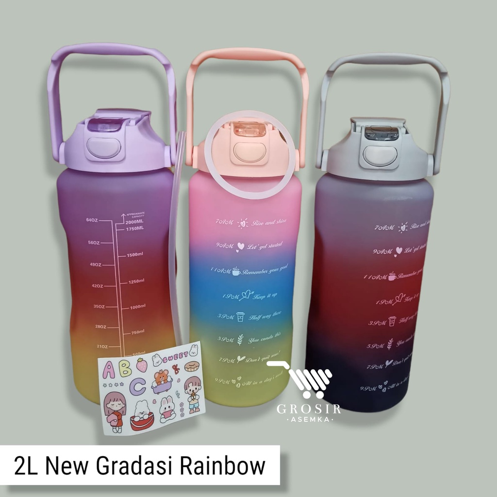 Botol Minum Motivasi 2000 ML 2 Liter Botol Minum Gradasi Sticker 2D & 3D Botol Minum Korea Penanda Waktu Viral
