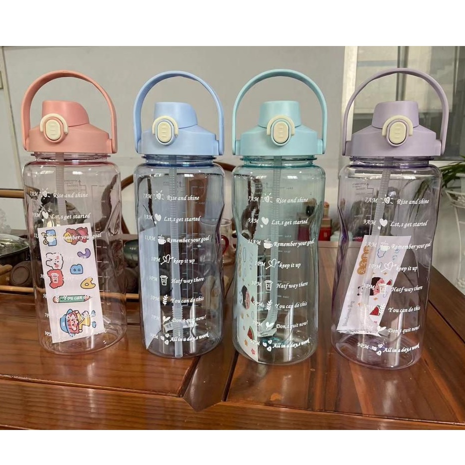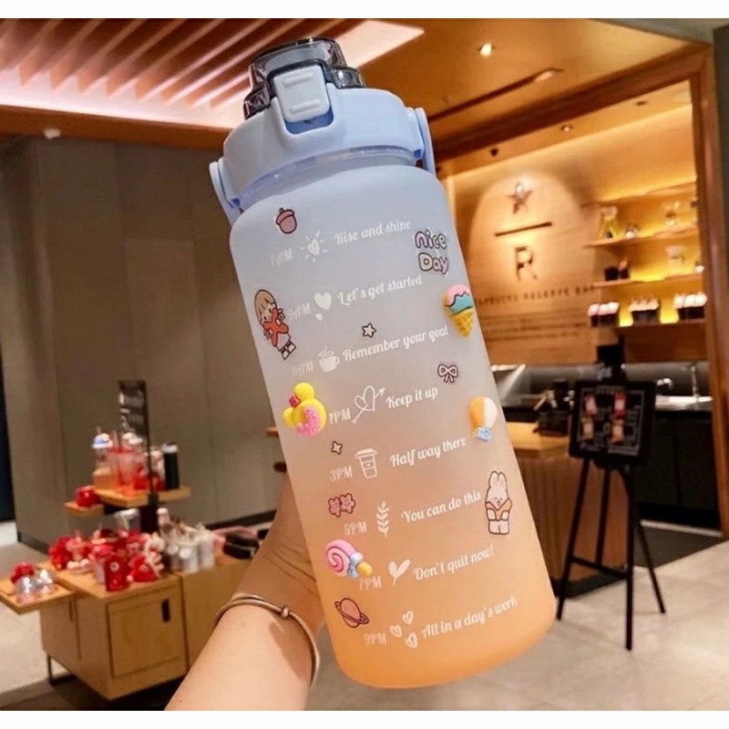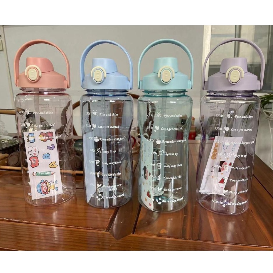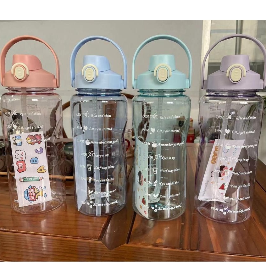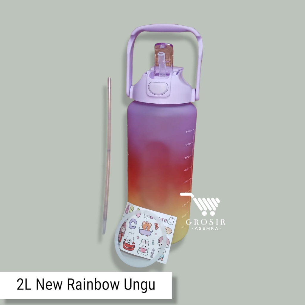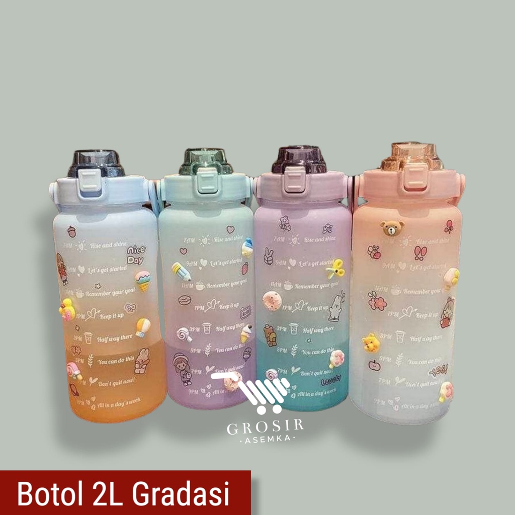 Botol Minum Motivasi 2000 ML 2 Liter Botol Minum Gradasi Sticker 2D & 3D Botol Minum Korea Penanda Waktu Viral
