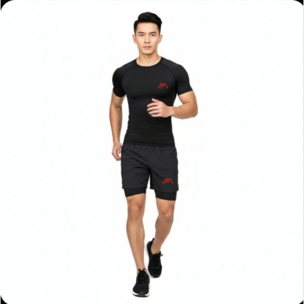 Setelan Running Baju Kaos Manset Pendek Baselayer Celana Pendek Joging Set Pakaian Olahraga Lari Set Baju Runing Pria Baju Setelan Olahraga Running Pria Sport