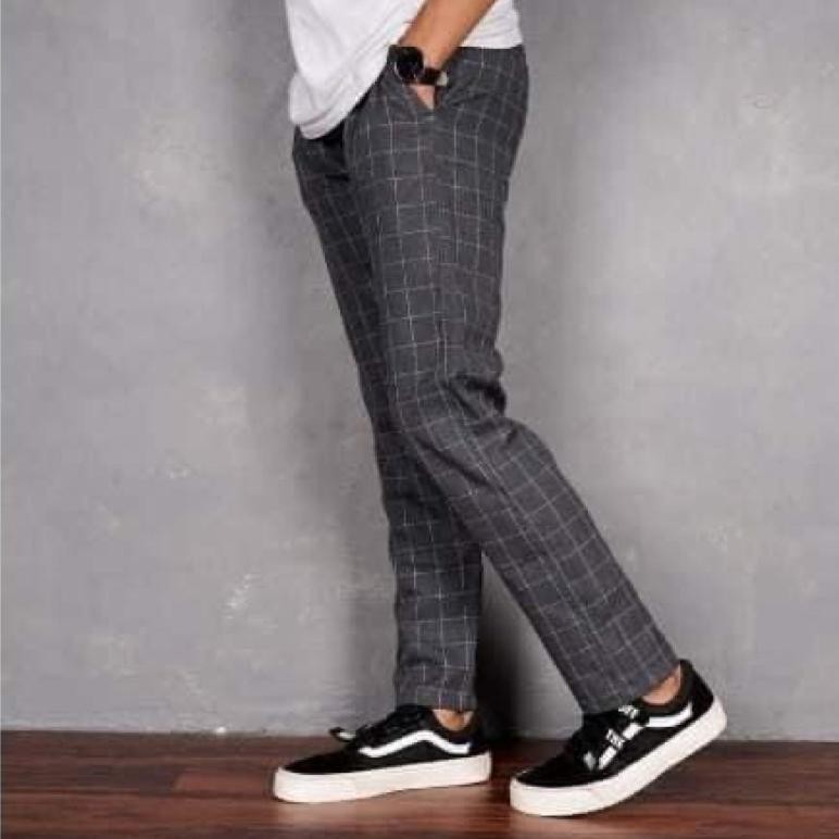 Celana Chino Tartan Pria Ankle Pants Motif Kotak2 Wanita Panjang Cowok Salur Model Slimfit Promo