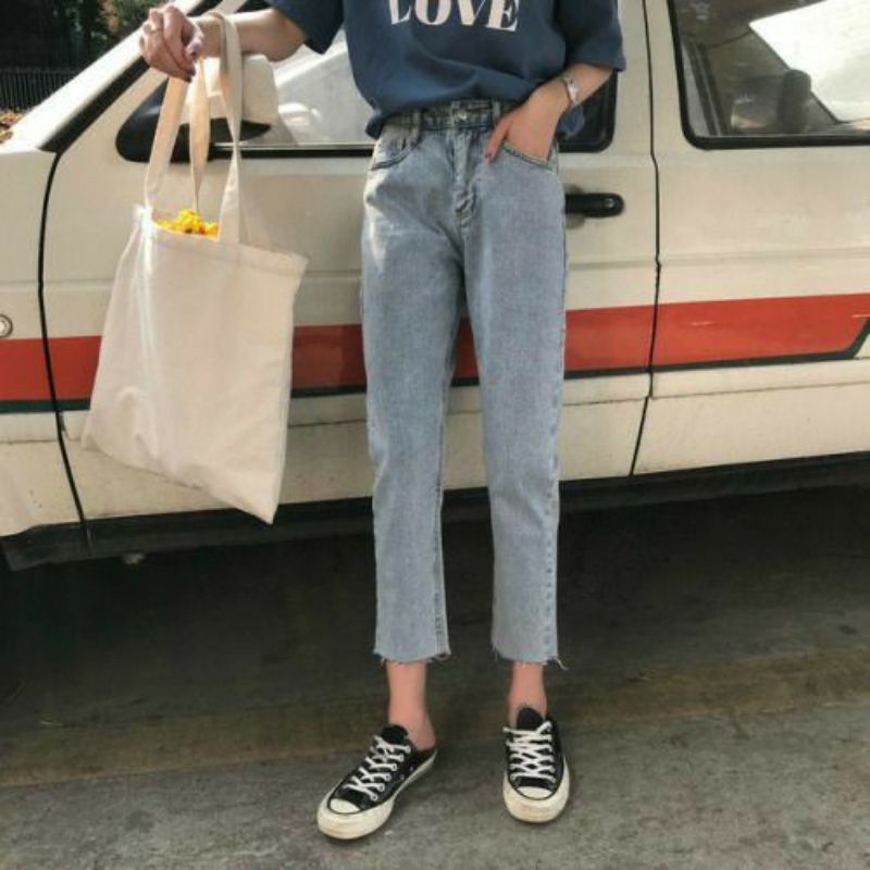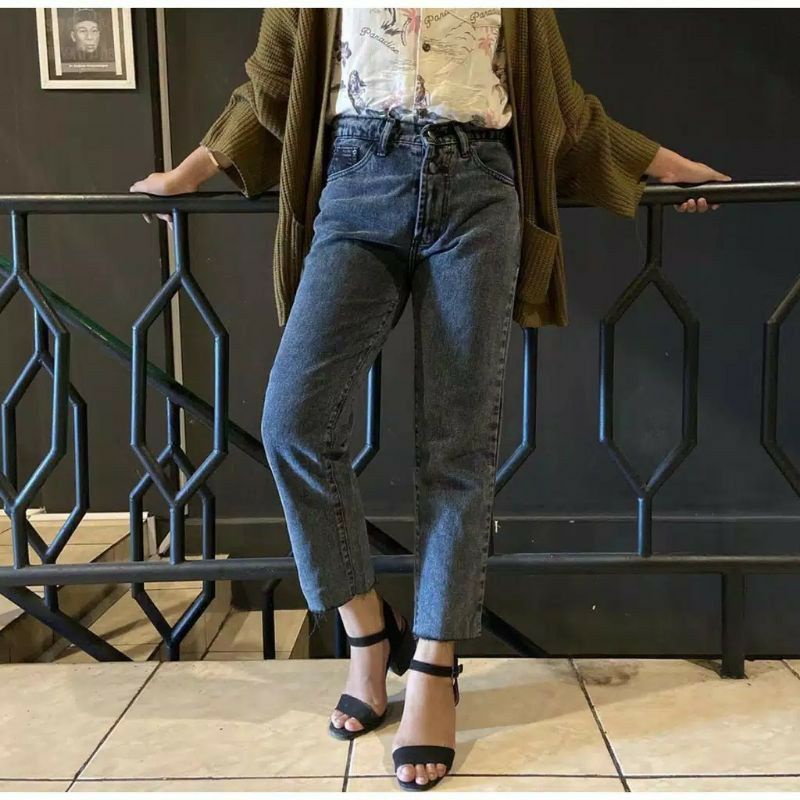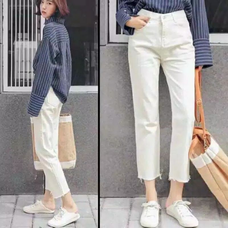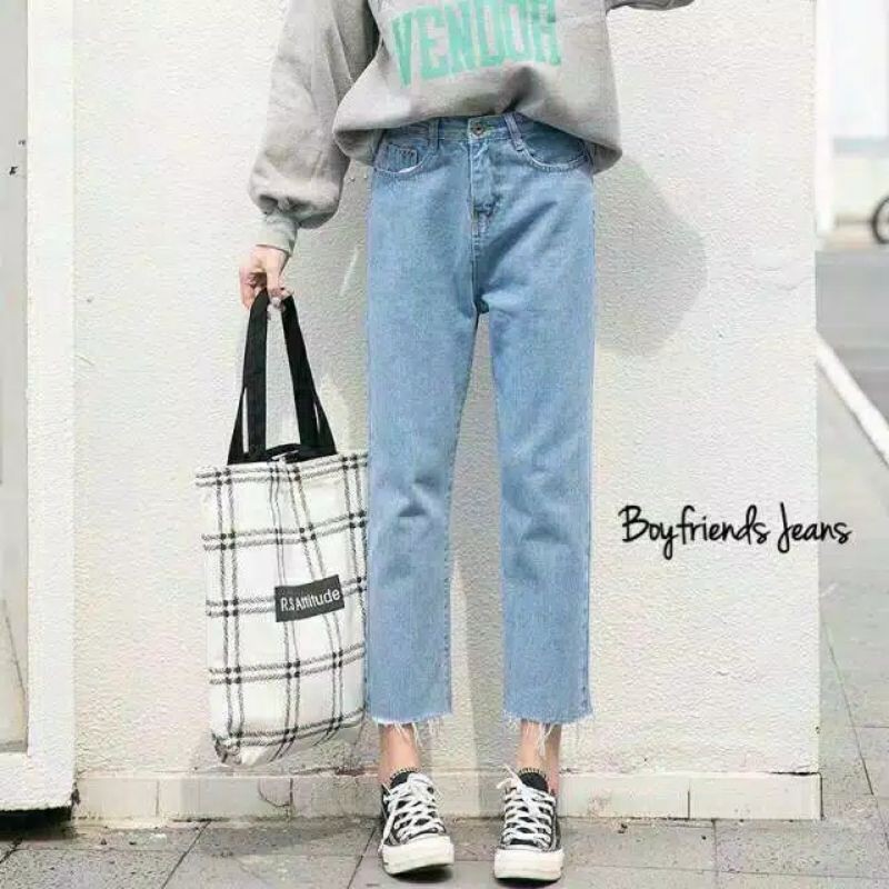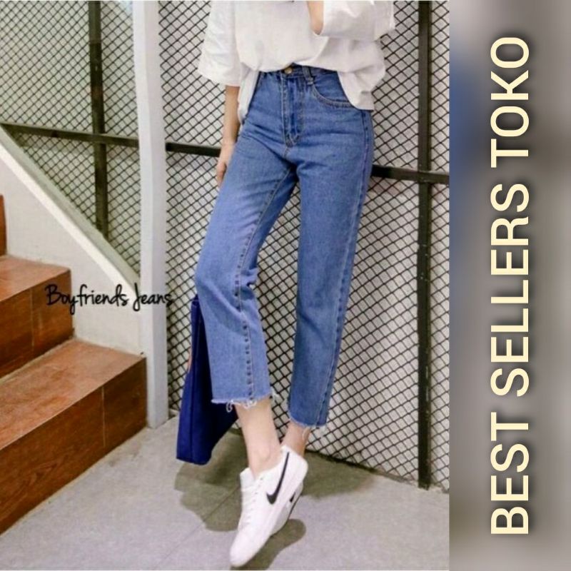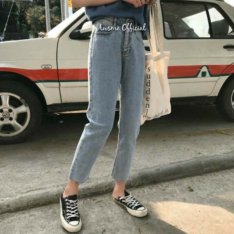 Awsme - Boyfriend Jeans Unfinished Kekinian Hw Jeans / Celana Highwaist Jeans / Haigh Waist Jeans / Hw Murah Putih Celana Hitam Panjang Bf Wanita