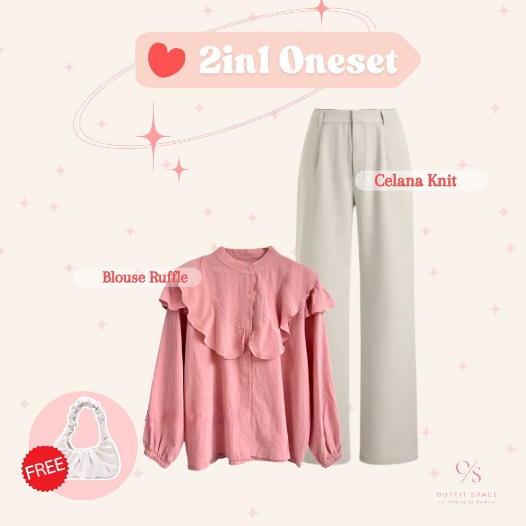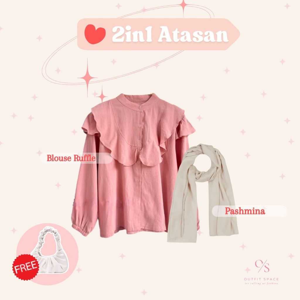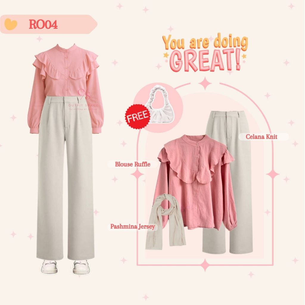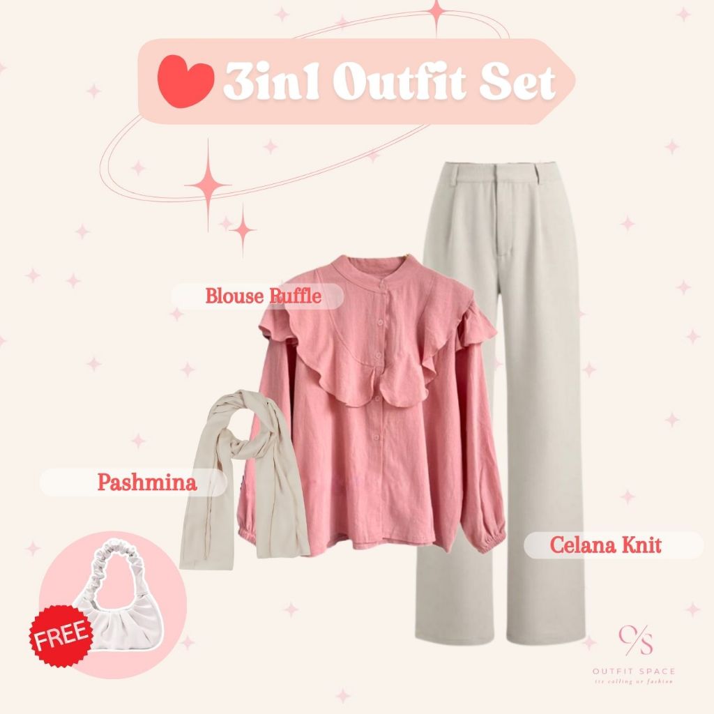 Outfit Hijab Style 1 Set - Pashmina Jersey Ivory, Blouse Ruffle Pink, Celana Knit - Setelan Hijab Wanita Elegan - OS41