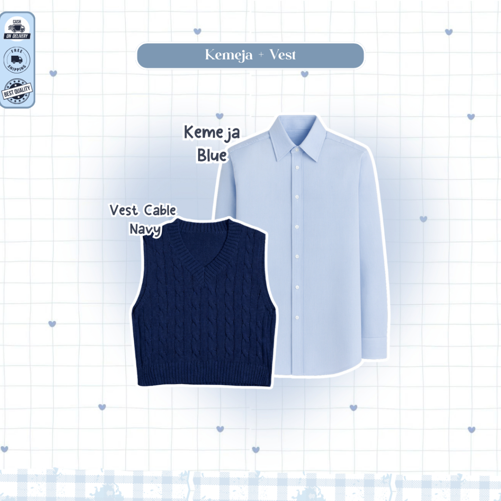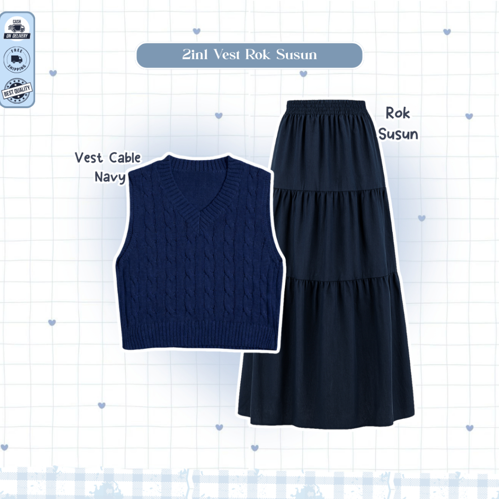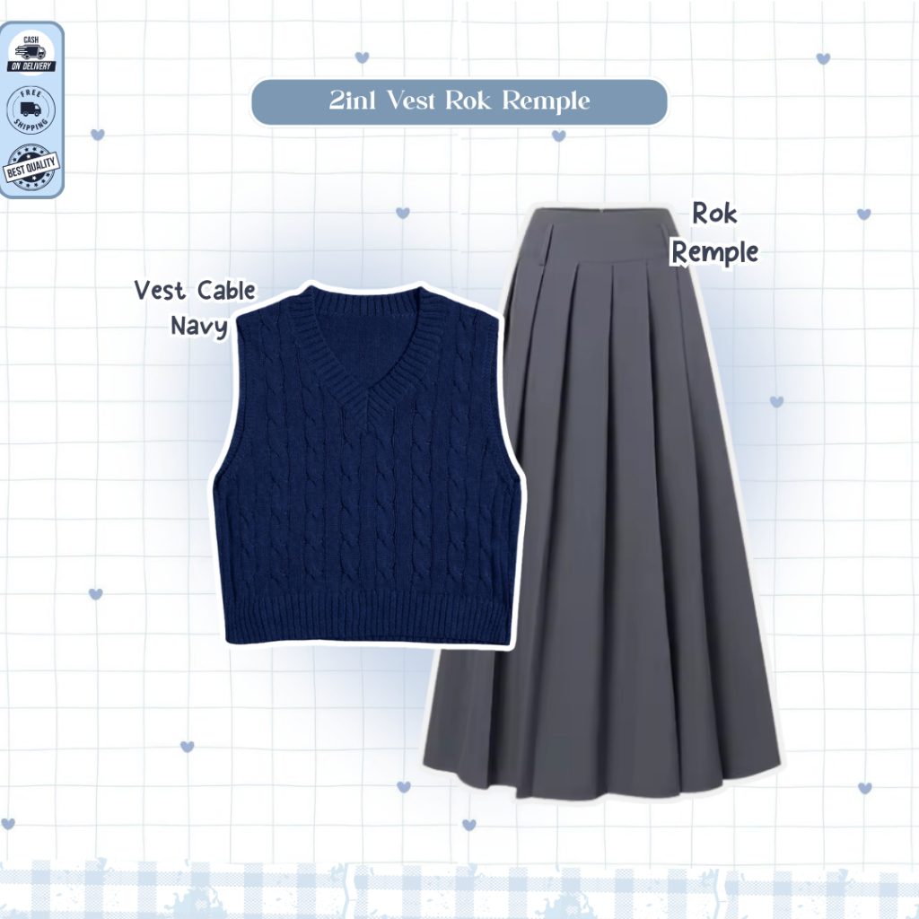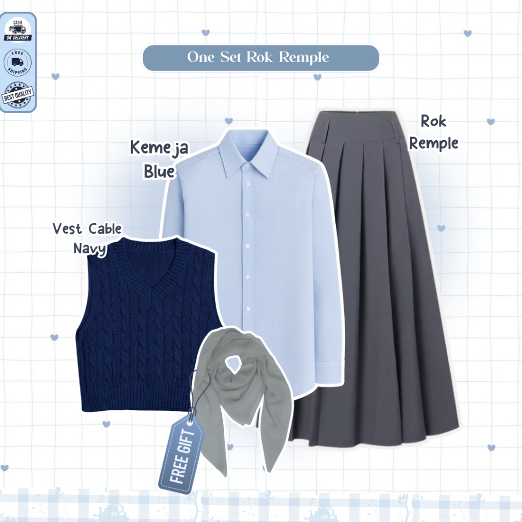 Mira One Set Lebaran 2026 Wanita ( Bella Square + Vest Navy + Kemeja Blue + Rok Susun ) - D109