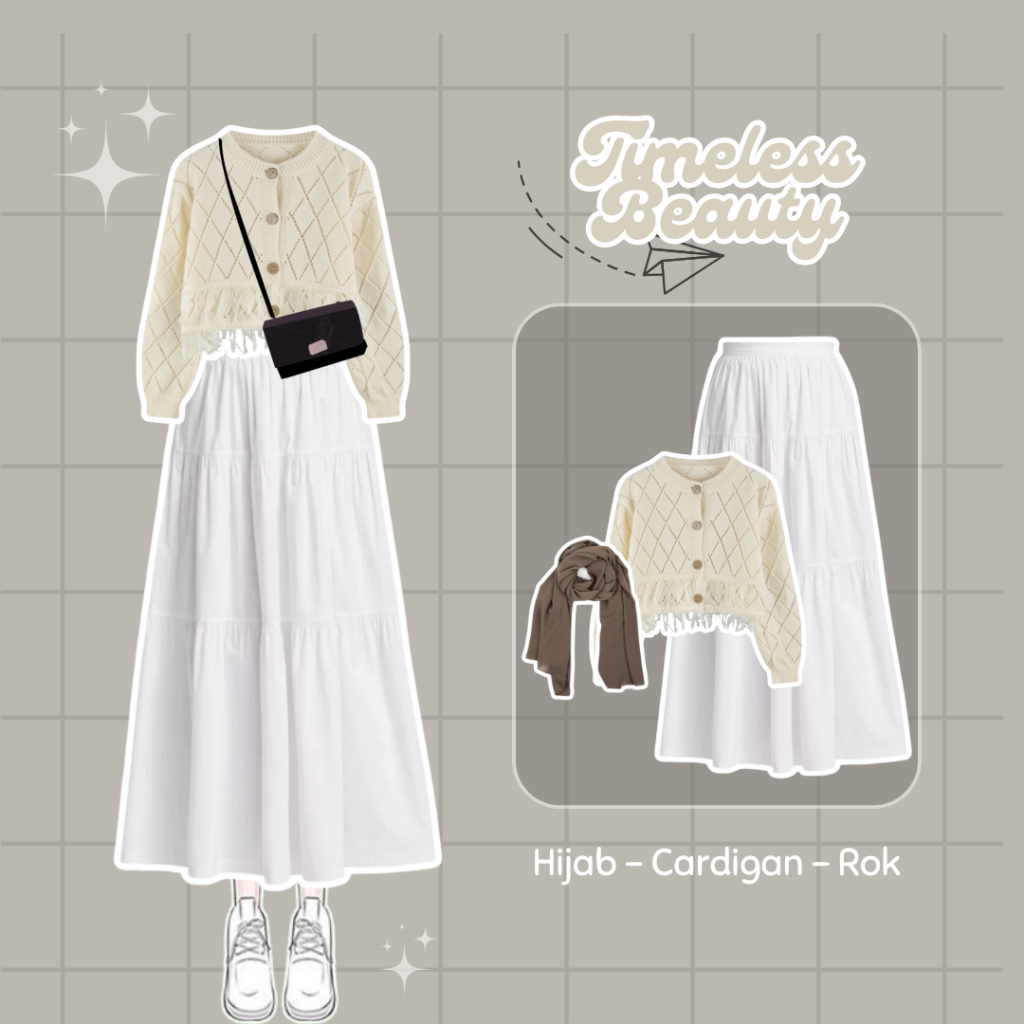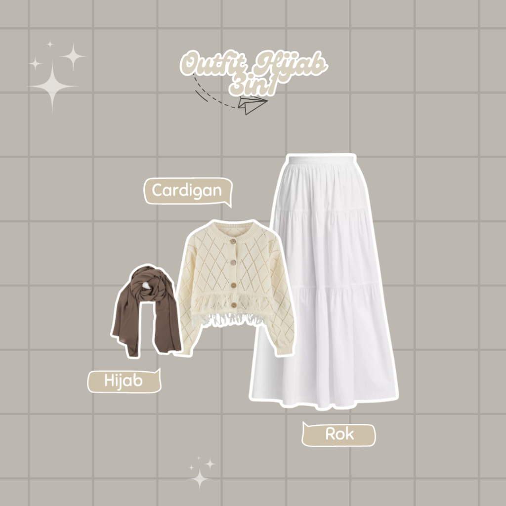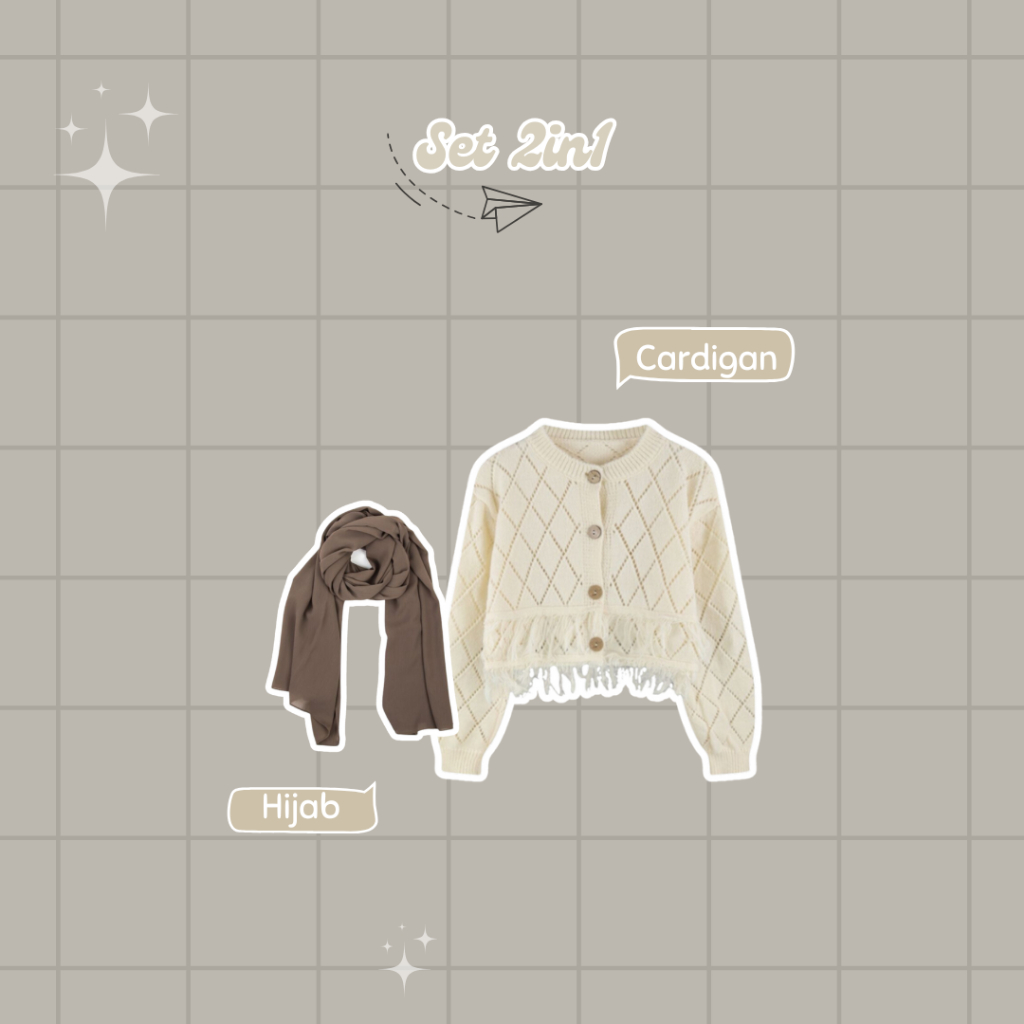One Set Beauty 3in1 ( Cardigan Rajut Rawis Broken White + Rok Susun Hyget Putih Premium + Hijab Pashmina Mocca Ceruti Babydoll ) Korean Style Outfit OOTD Kekinian Classic Modern - BE65