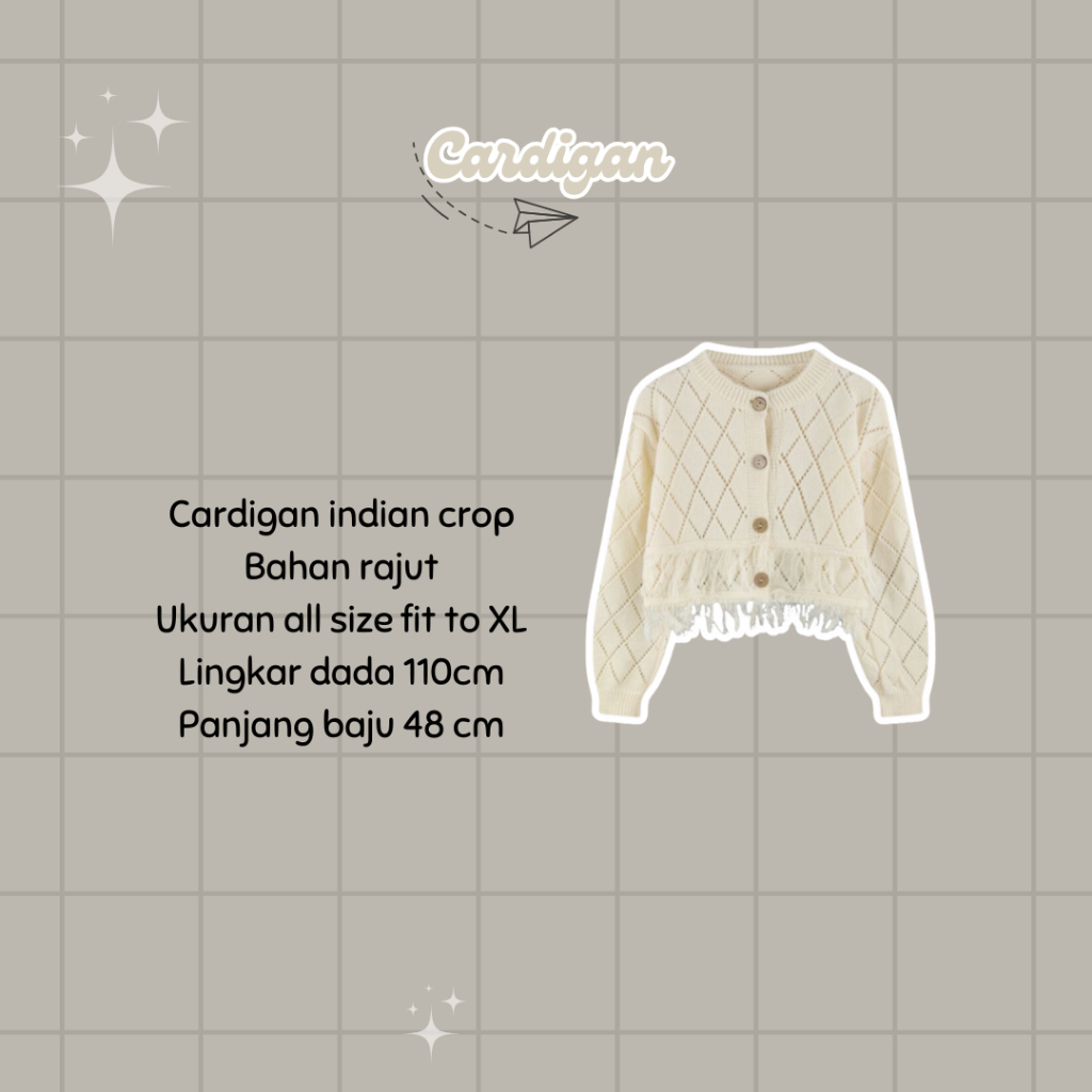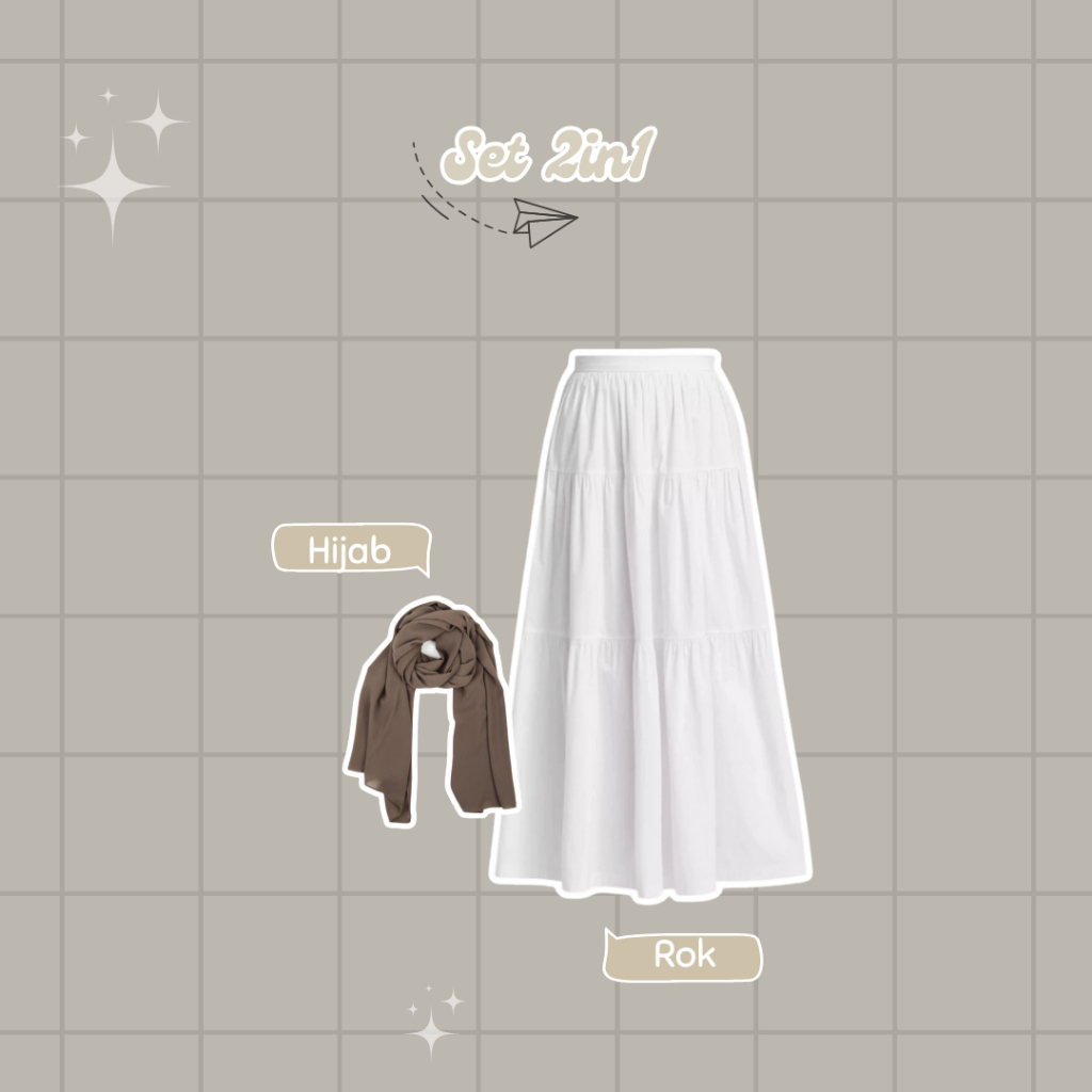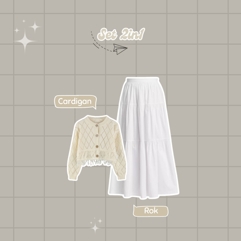 One Set Beauty 3in1 ( Cardigan Rajut Rawis Broken White + Rok Susun Hyget Putih Premium + Hijab Pashmina Mocca Ceruti Babydoll ) Korean Style Outfit OOTD Kekinian Classic Modern - BE65