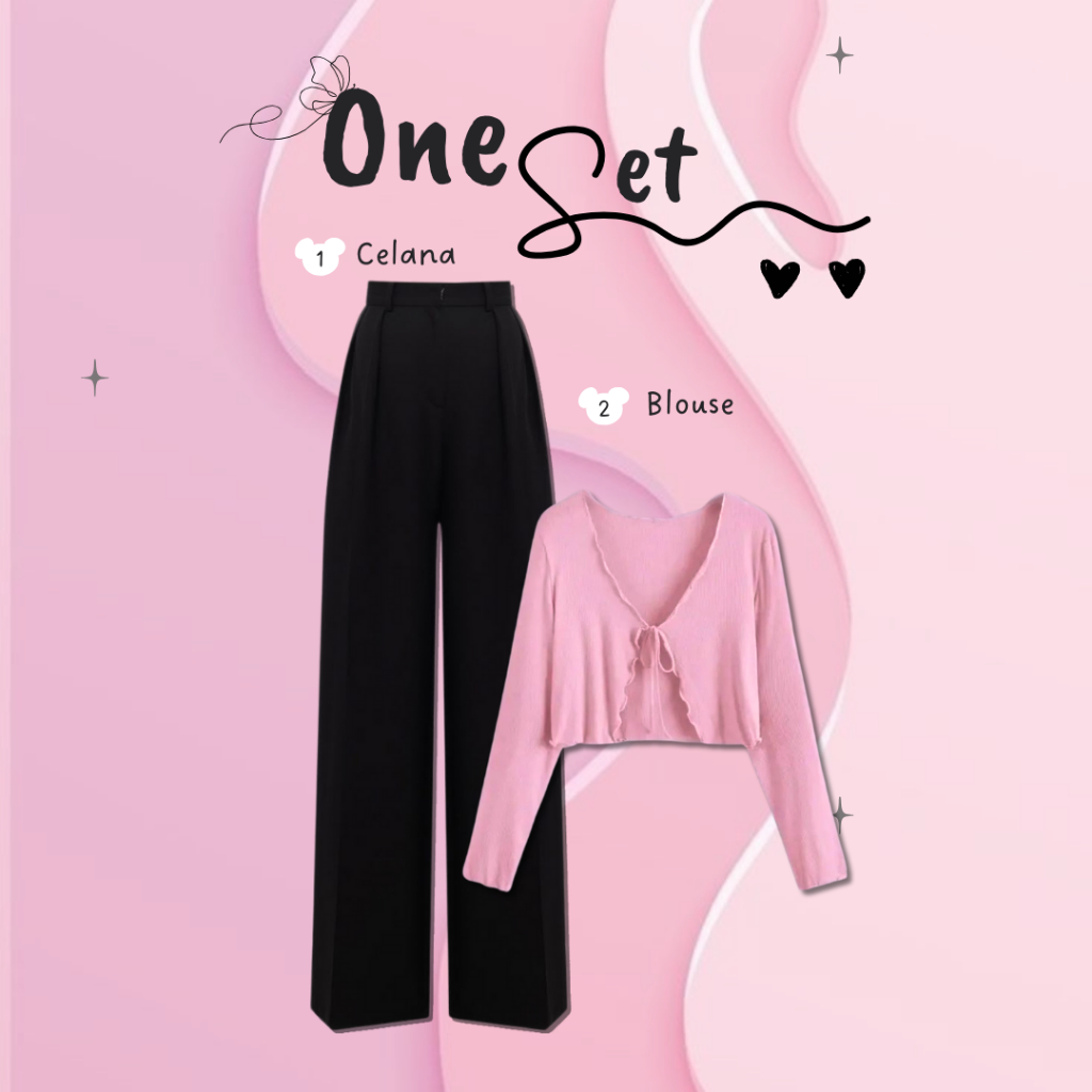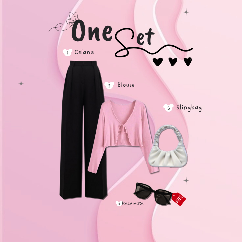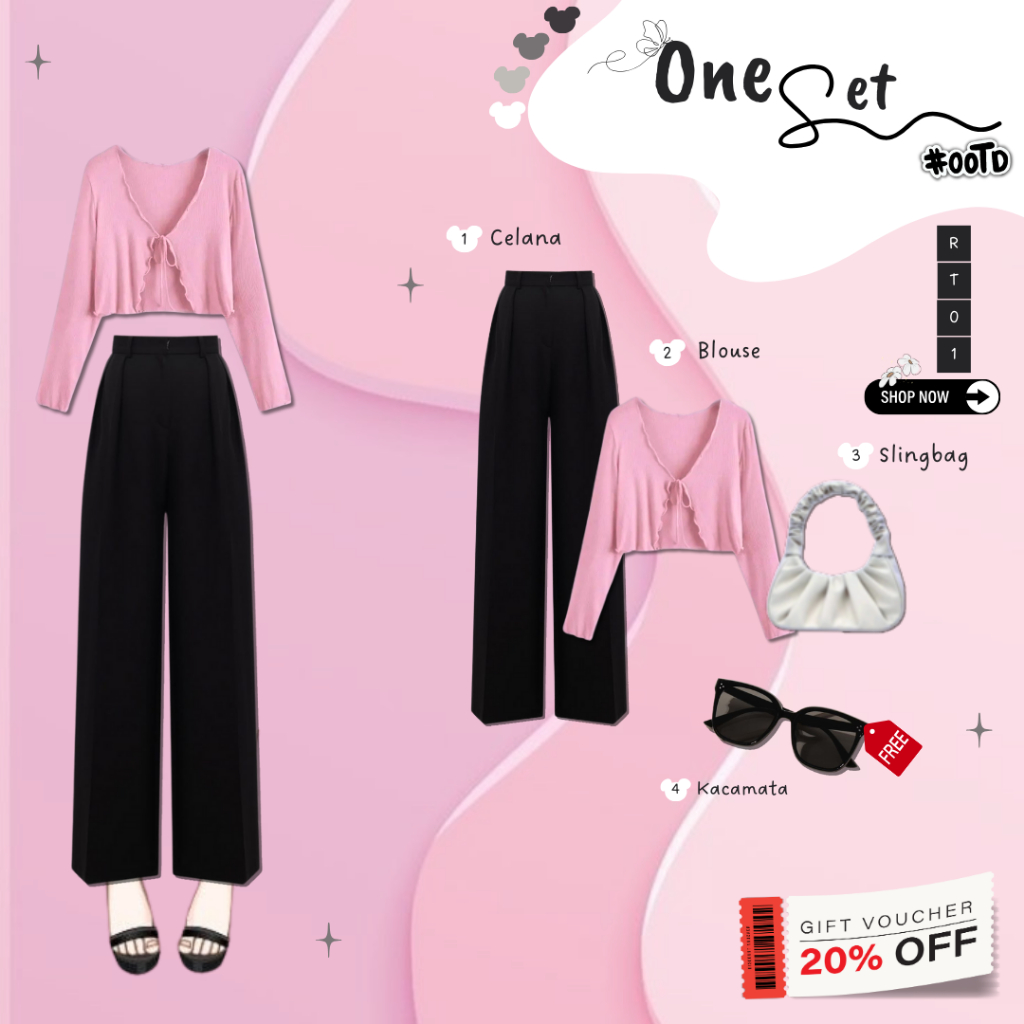 OOTD Kekinian dengan Sentuhan Pink & Hitam One Set Blouse & Wide Pants (Cardigan, Celana, Tas, dan FREE Kacamata)