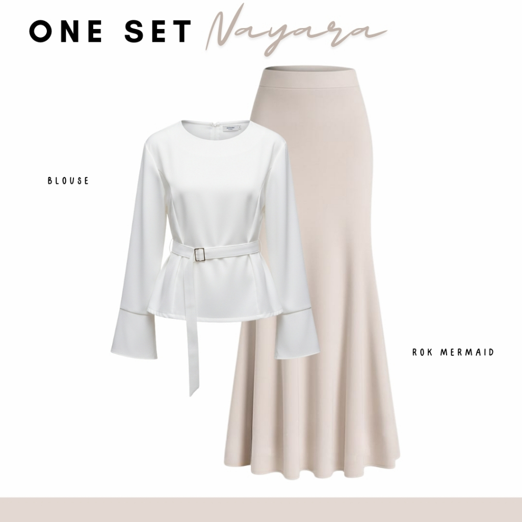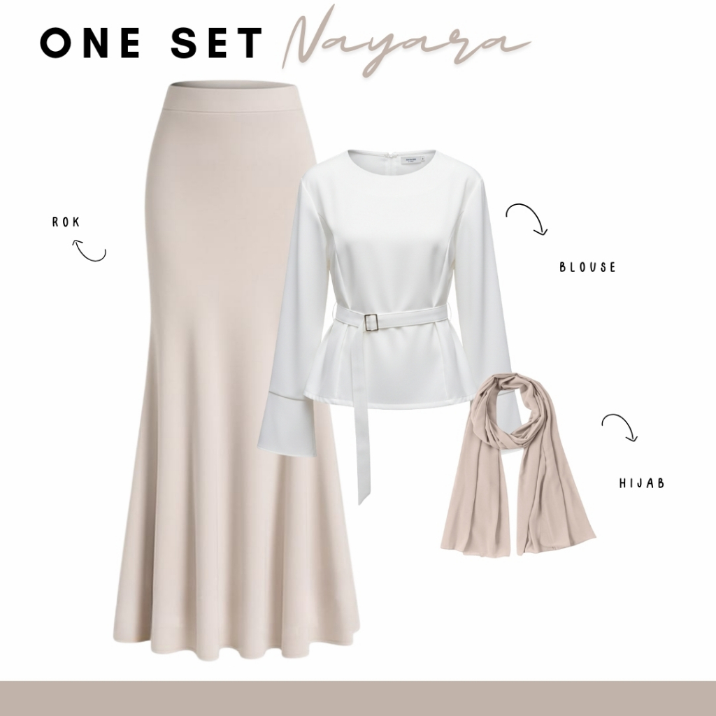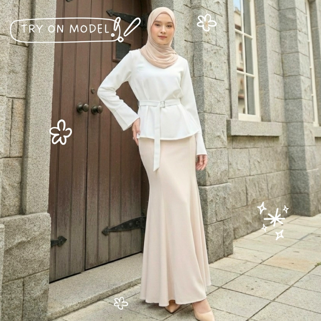 One Set Wanita 3in1 || OOTD Wanita Kekinian Remaja Hijab ( Blouse +rok Duyung Ivory + Pasmina Polycotton ) One Set Raya Series Nayara