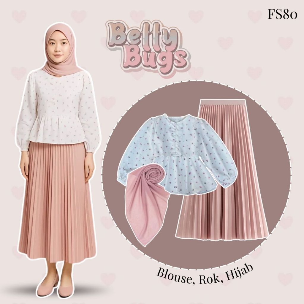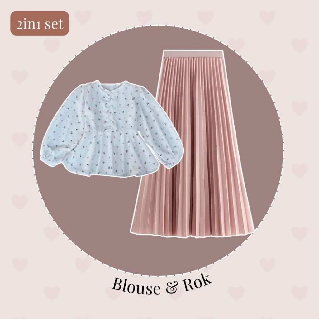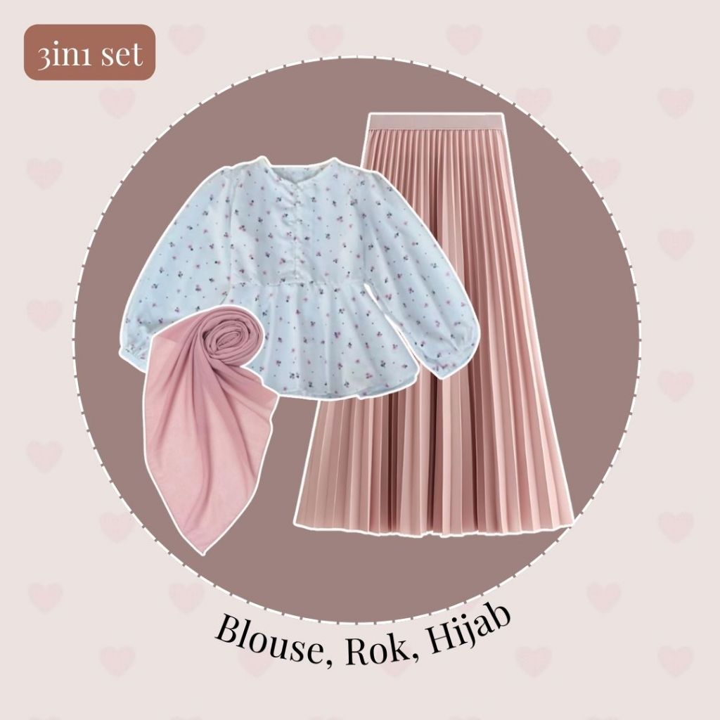 Outfit Hijab OOTD Kekinian (Blouse, Rok, Hijab) One Set Wanita Remaja Simple Bunga-bunga | FS80