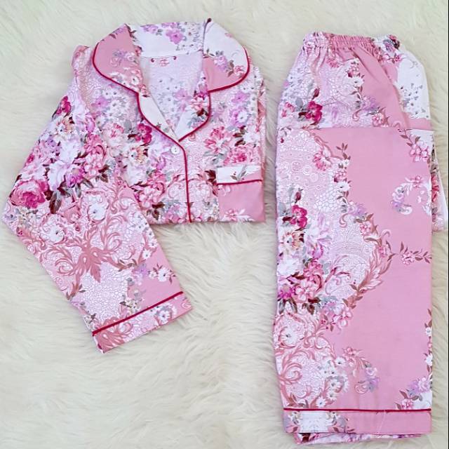 Baju Tidur Piyama Wanita Bahan Katun Jepang Motif Flower Pink All Size L Lengan Pendek Celana Panjang (CP), Lengan Panjang Celana Panjang (PP)