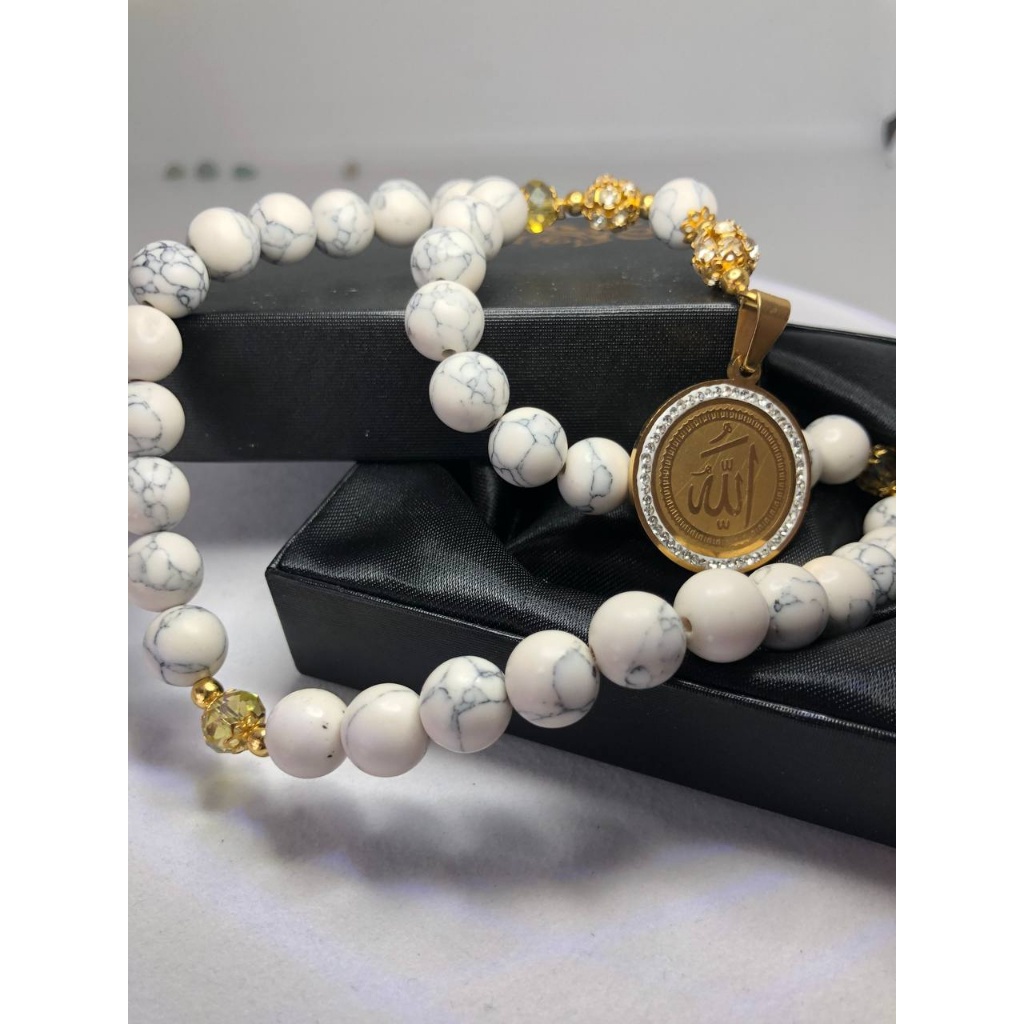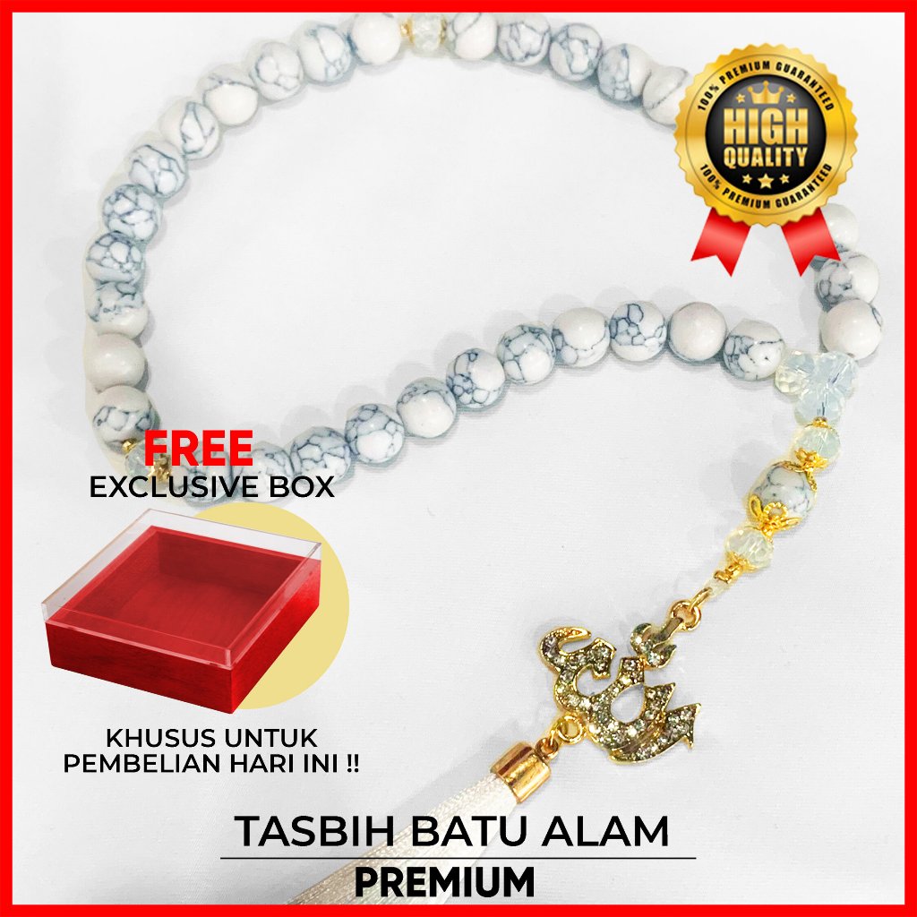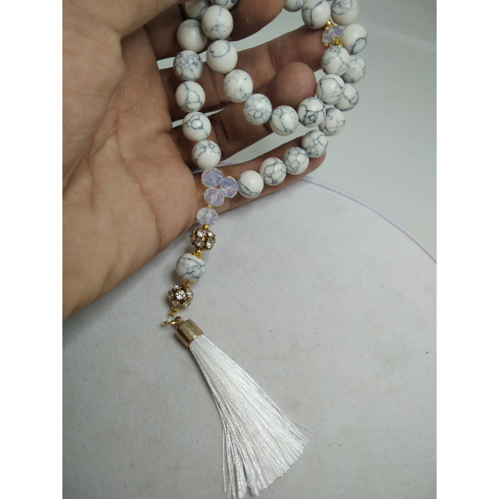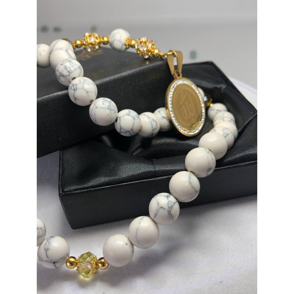 Wearmoura Tasbih Premium Warna Putih / Eternal Serenity Tasbih / Tasbih Batu Giok Alam Rumbai / Tasbih 33 Butir / Tasbih Kekinian dengan Liontin + Lafadz ALLAH / Tasbih 99 Butir Premium batu