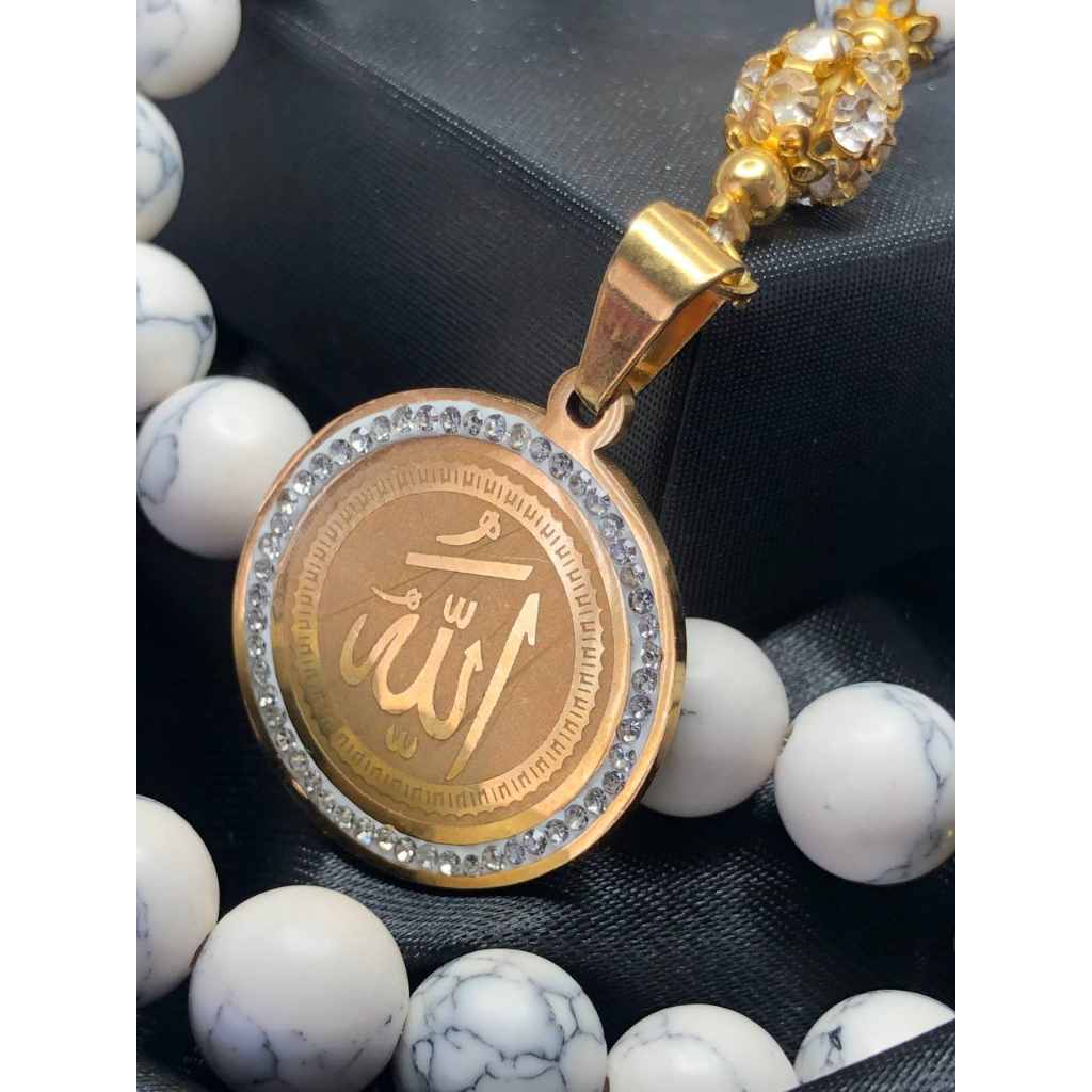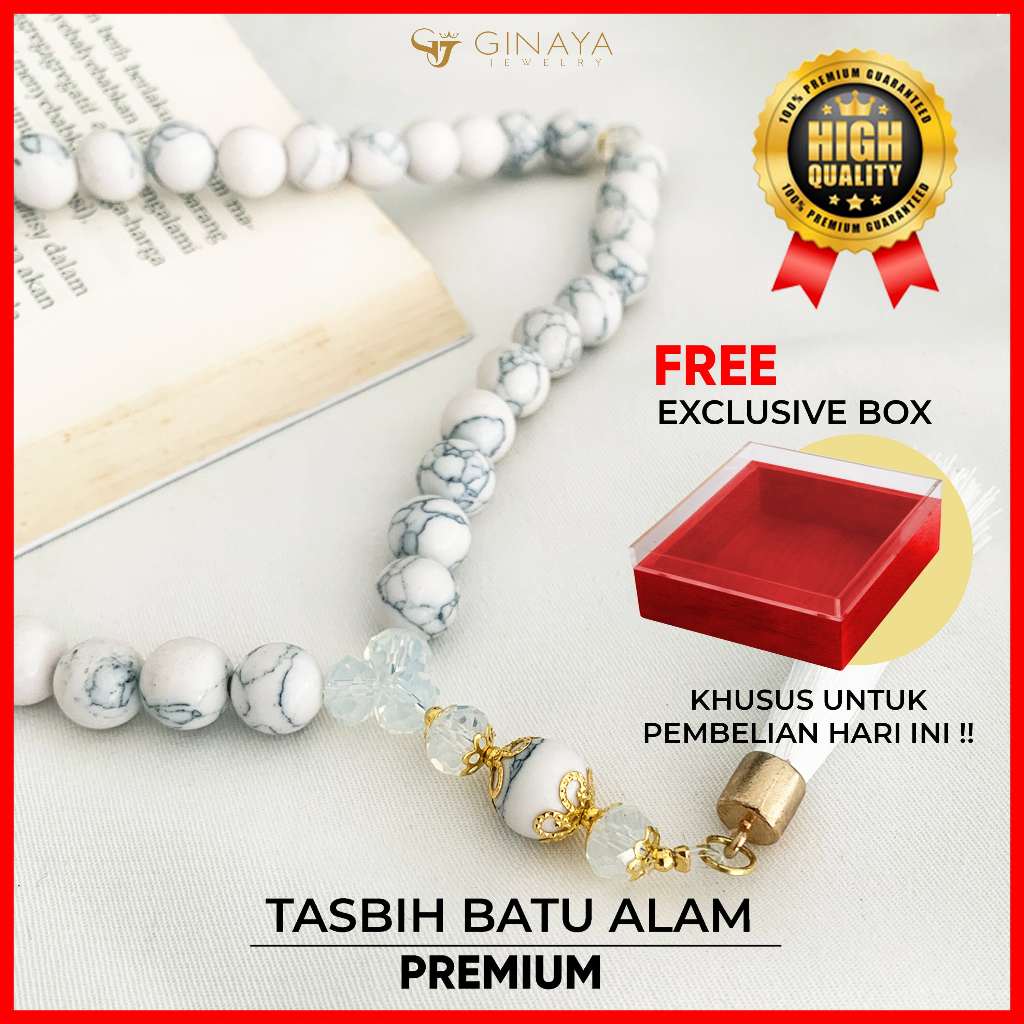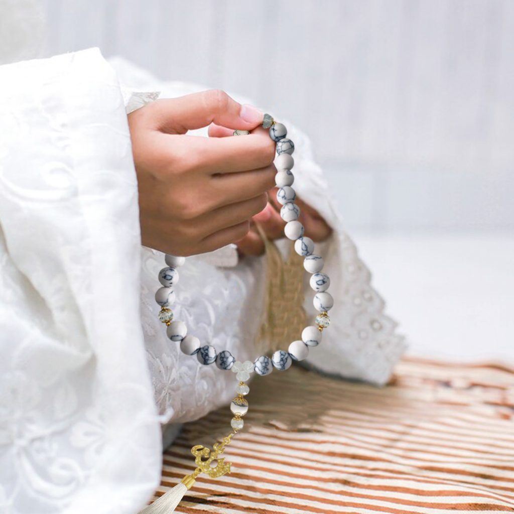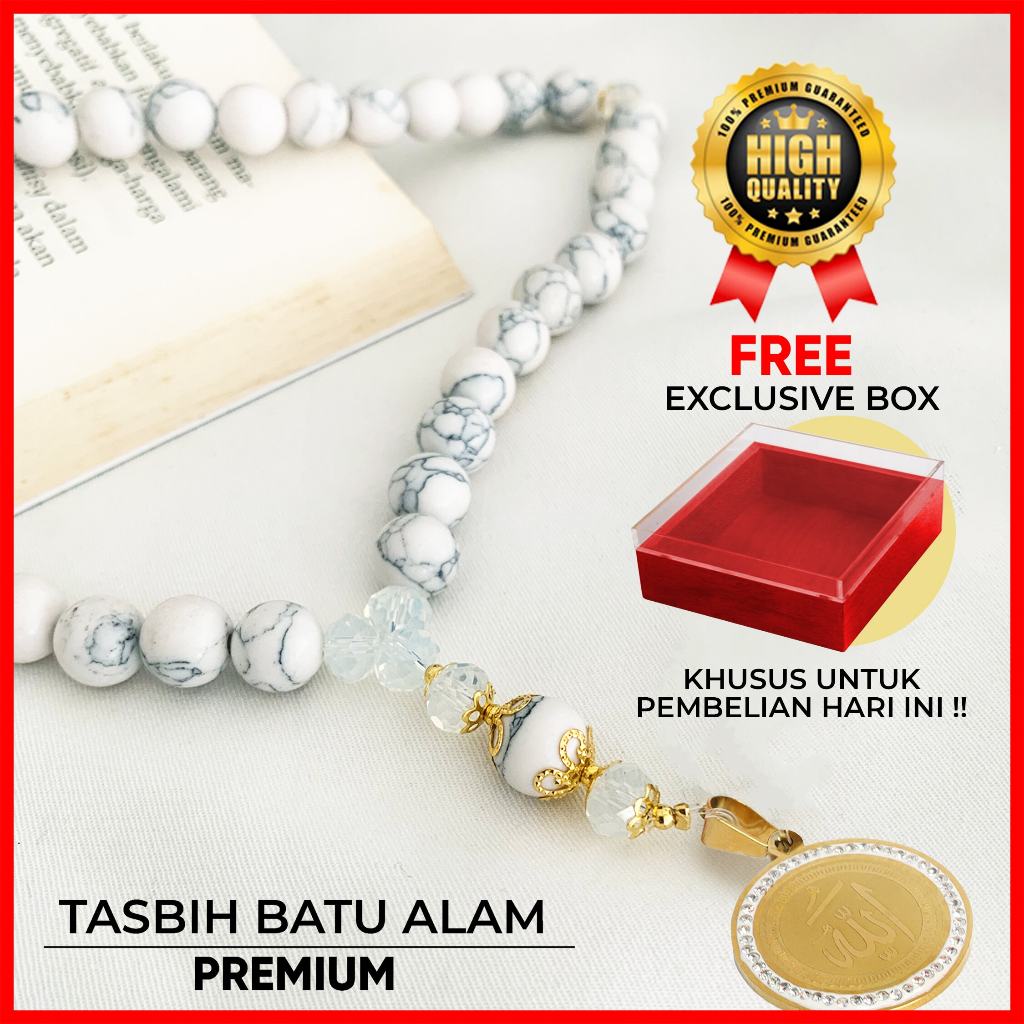 Wearmoura Tasbih Premium Warna Putih / Eternal Serenity Tasbih / Tasbih Batu Giok Alam Rumbai / Tasbih 33 Butir / Tasbih Kekinian dengan Liontin + Lafadz ALLAH / Tasbih 99 Butir Premium batu